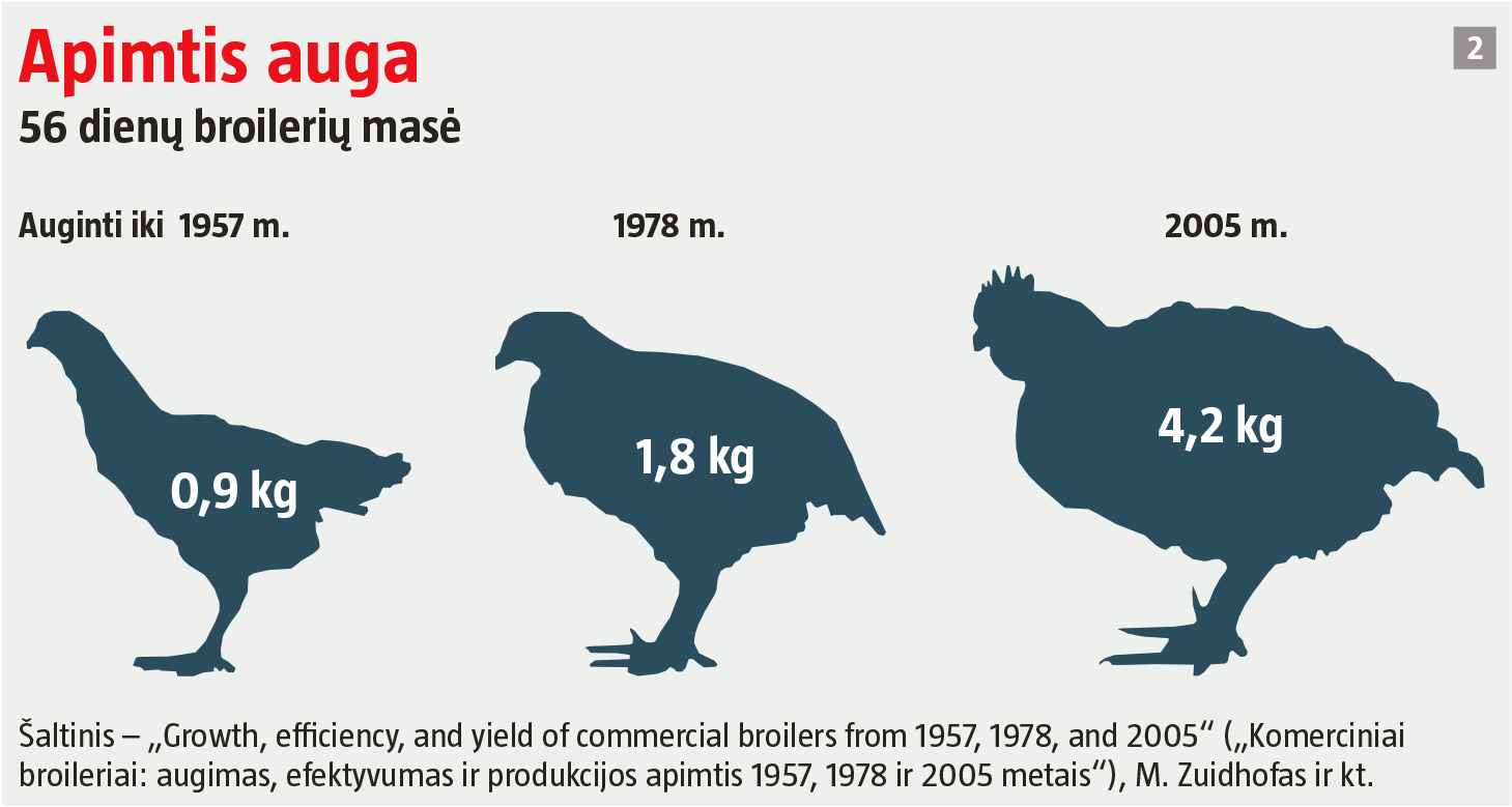 Vėliau viščiukai tik didėjo. Martinas Zuidhofas su kolegomis iš Albertos universiteto atliko tyrimą, kuriame palygino selekcijos rezultatus 1957, 1978 ir 2005 m. Autoriai nustatė, kad vidutiniškai 56 dienų viščiukai svėrė atitinkamai 0,9, 1,8 ir 4,2 kilogramo (žr. 2 grafiką). Kadangi vieną didelį paukštį galima užauginti efektyviau nei du mažesnius, ūkininkams kilogramui vištienos užauginti šiandien pakanka 1,3 kilogramo grūdų, o 1985 m. reikėjo 2,5 kilogramo.