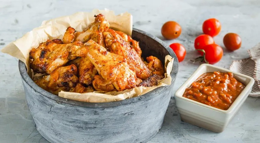 Reikės (7 porcijoms): 2,5 kg viščiukų sparnelių, druskos, šviežiai maltų juodųjų pipirų; padažui: 1 svogūno, 3 česnako skiltelių, 2 šaukštų aliejaus, 3 šaukštų adžikos, 400 g trintų pomidorų, 1 šaukšto garstyčių, 3 šaukštų vyno acto, žiupsnelio Kajeno paprikų, 1 šaukšto cukranendrių cukraus.