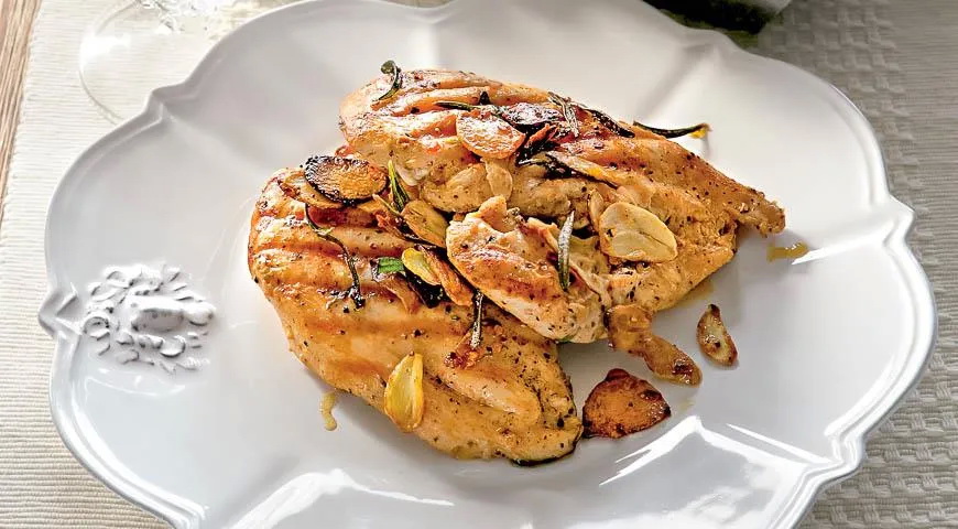 Reikės (6 porcijoms): 6 stambių viščiukų krūtinėlių, 2 česnako skiltelių, 2 rozmarino šakelių, 1 šaukštelio rupios druskos, 1 šaukštelio šviežiai maltų pipirų, 0,5 šaukštelio aitriosios paprikos, 1 citrinos sulčių, 0,25 stiklinės alyvuogių aliejaus „extra virgin“ (ir dar šiek tiek – aptepti), 4 plytų, folijos, ąžuolo skiedrų – griliui.