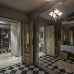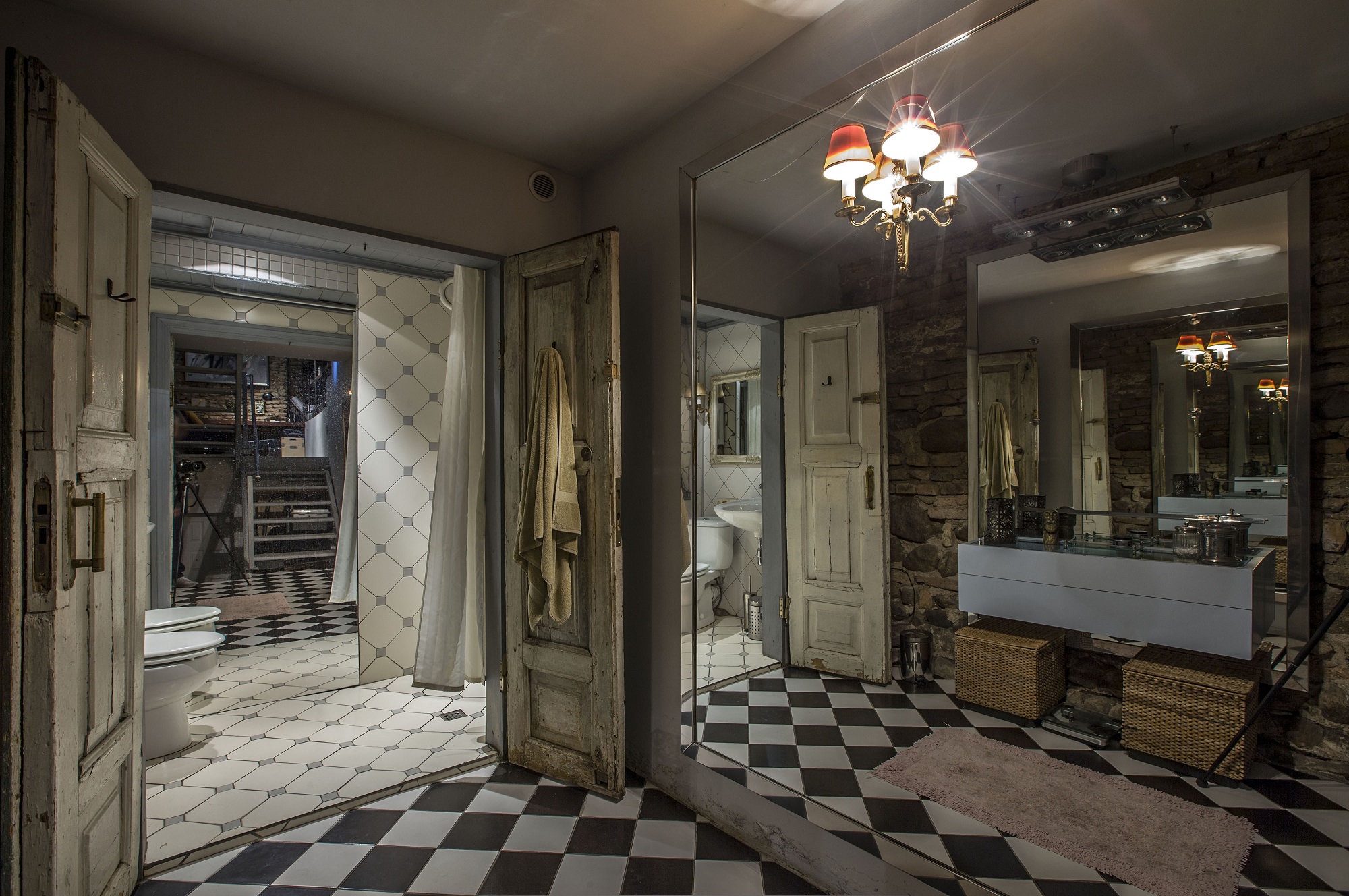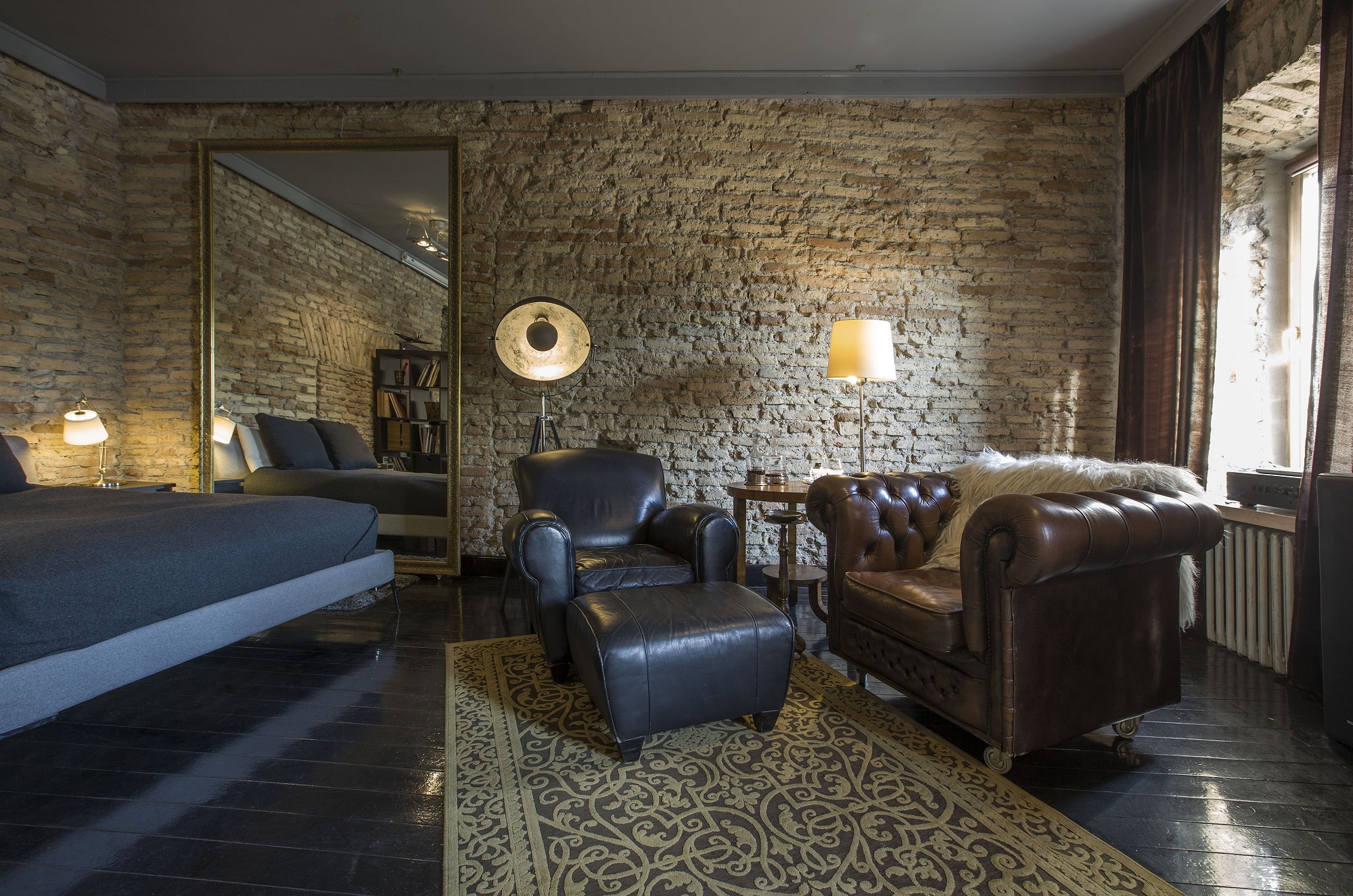 Kertiniai bet kurio būsto interjero elementai, – sienos, grindys, lubos, – paprastai pareikalaujantys daug energijos, investicijų ir idėjų, palikti kaip buvę. Prieškambariui ir žemiau esančioms patalpoms dinamikos suteikia margi grindų plytelių raštai. Didysis kambarys juodai dažytomis grindimis dvelkteli lengvu teatrališkumu. Šį įspūdį dar labiau sustiprina didžiuliai veidrodžiai masyviais aukso spalvos rėmais – tai palikimas iš fotostudijos etapo.
