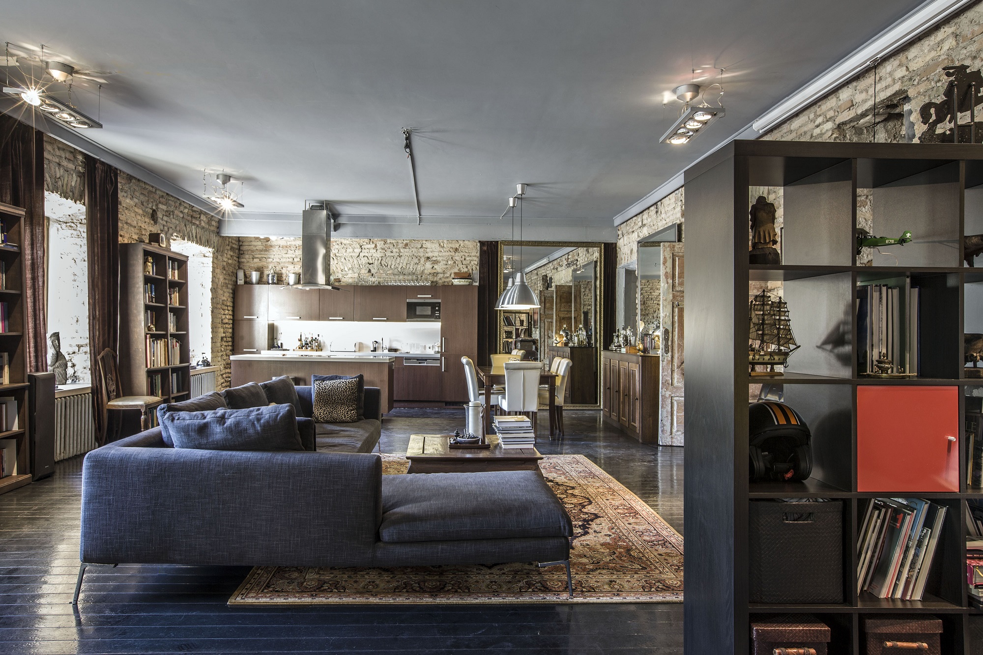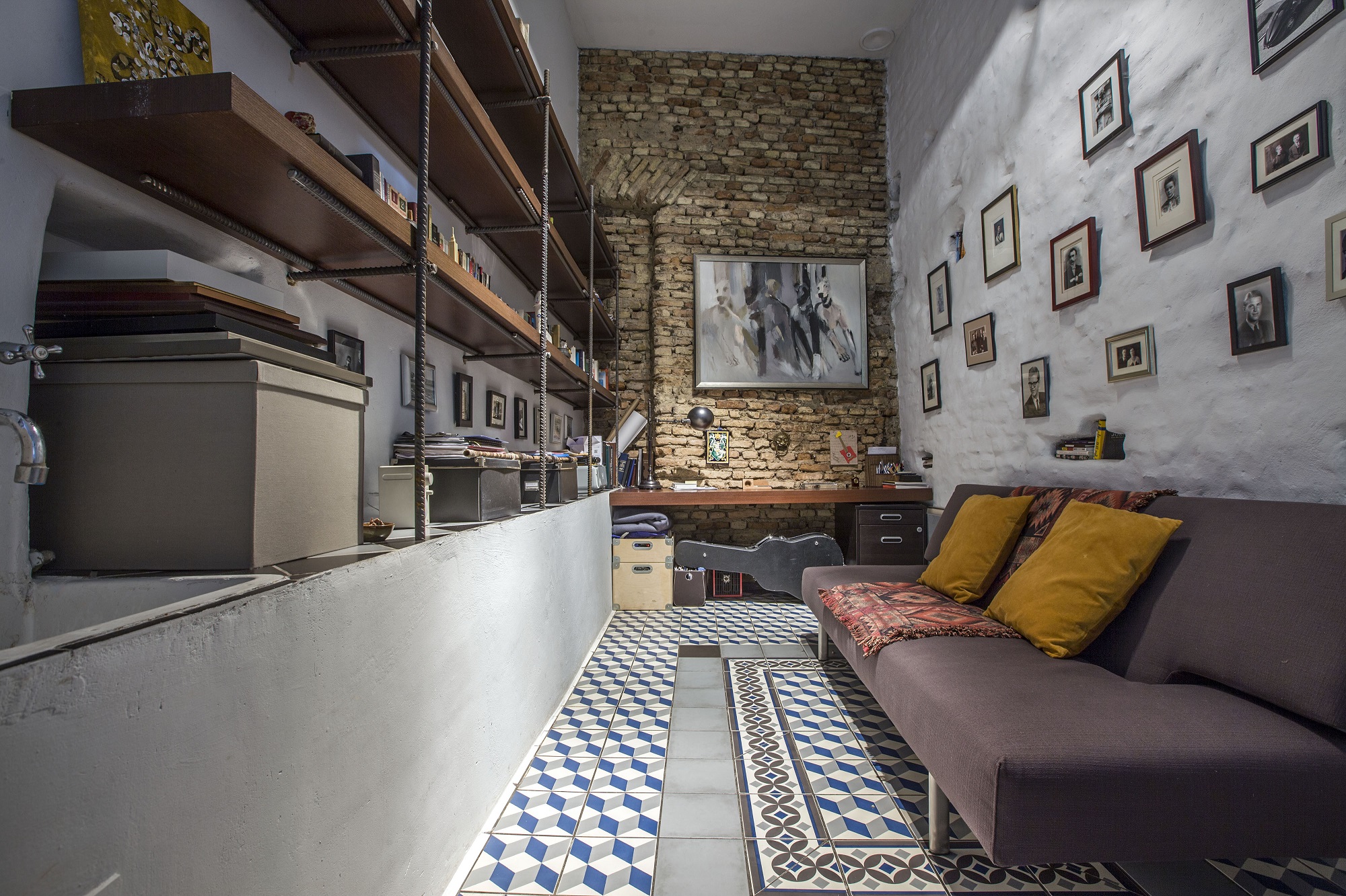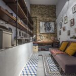 Visgi netrukus gana lengvai, be ypatingų pertvarkų ar remontų buvusi fotostudija virto jaukiais namais. Didžiausia jų dalis tenka bendrajam kambariui, kuriame be jokių stacionarių pertvarų įkurtos virtuvės, svetainės, valgomojo ir miegamojo zonos. Iš prieškambario metaliniais laiptais žemyn galima nusileisti į tarpuaukštį, kuris prireikus tampa svečių miego vieta, dar žemiau – tualeto patalpa.