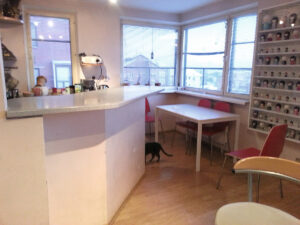 Šviesių tonų didumai kontrastą sudaro ryški sofa. Nedidelė, tačiau iškart pastebima, ji harmoningai dera su japoniškų lėlių – šiuolaikinio stiliaus („Kimmidoll“) ir klasikinių (kokeshi) kolekcija. Virtuvės ir valgomojo zonoje vyrauja baltos spalvos ir natūralaus ąžuolo paviršių derinys. Dar gerokai iki remonto pradžios nusižiūrėtas stalas bei šviestuvas virš jo pasufleravo toną ir virtuvės baldams – stalviršis pagamintas iš tokios pat ąžuolo medienos.