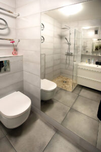 Šeimininkai nenorėjo dušo kabinos, jie nusprendė įsirengti dušą, kuriame vandenį surinktų grindyse paslėptas trapas. Tiesa, dėl trapo aukščio teko pakelti grindis visoje patalpoje – dabar įeinant į vonios kambarį yra laiptelis. Daugiau kliūčių šioje patalpoje nėra, todėl nereikia bijoti užkliūti slystelėjus. Dušo zoną nuo likusios patalpos skiria varstoma stiklinė pertvara – ji sulaiko vandenį prausiantis, tačiau yra beveik nematoma, todėl vonia atrodo labai vientisa.