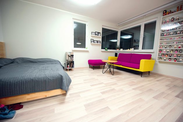 Prieš įsigydami baldus, Vaidas ir Rūta kruopščiai matavo patalpas ir „stumdė“ juos iš vietos į vietą. Kad būtų lengviau įsivaizduoti, kiek erdvės užims vienas ar kitas baldas, jo vietą ant grindų žymėdavo lipnia juostele. Nors buto plotas nemažas, vis tiek norėjosi išsaugoti kuo daugiau laisvos erdvės.