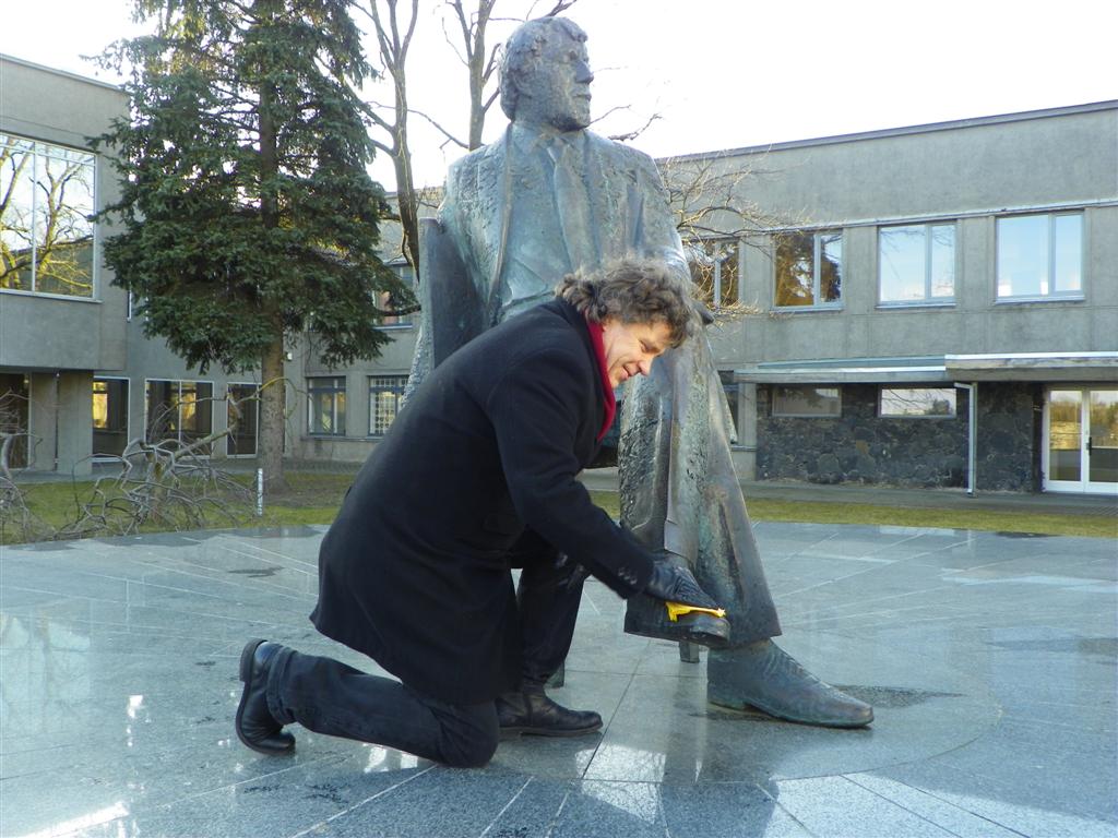 Prie režisieriaus paminklo vyko improvizacija. Teatralai sugiedojo savo himną ir pasiėmę geltonas šluostes valė batus. Kiekvienas paslapčiomis žvilgčiojo į maestro statulą – galbūt teatro genijus atsimerkė.