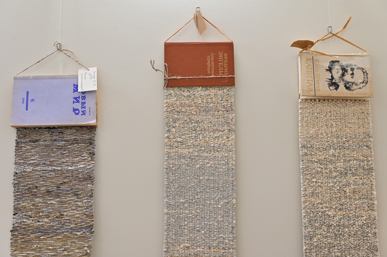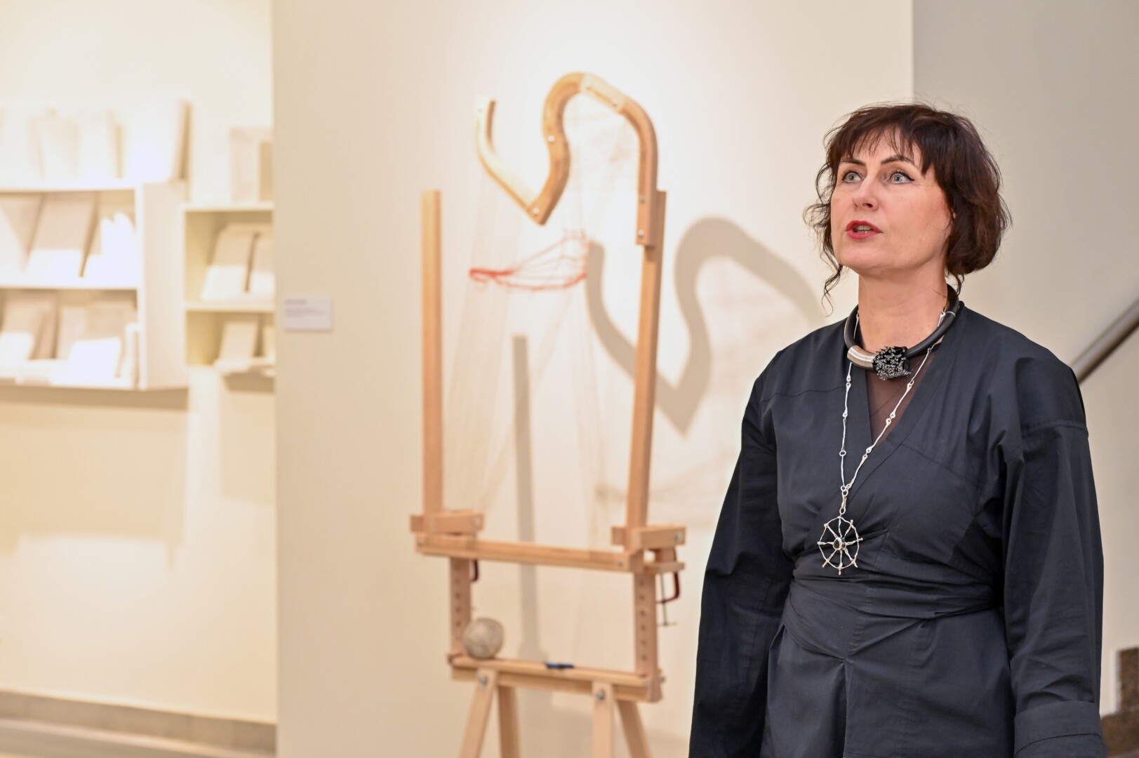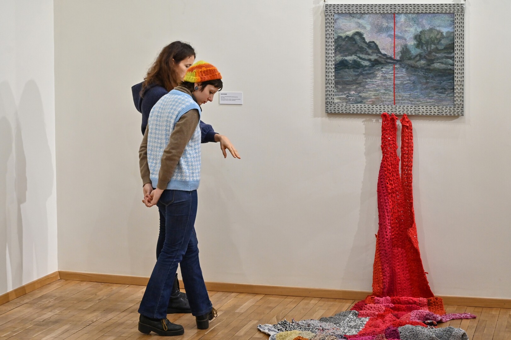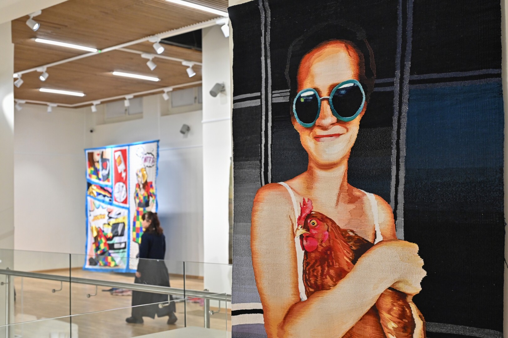 Čia ir rankinėmis nyčių staklėmis išausta lovatiesė, bet išausta ne iš tradicinių siūlų, o plonyčių metalo gijų, kamšyti yra vilnos kūriniai, susiūti megztiniai. Neįmanoma atitraukti akių nuo vieno efektingiausių eksponatų – medinių lentų, siuvinėtų kryželiu.