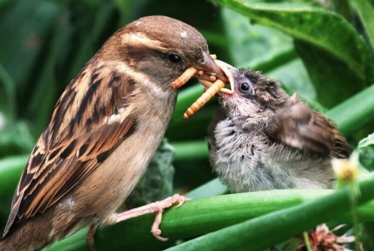 Pavasarį ir vasarą žvirbliai tampa vikriais medžiotojais: tėvai maitina savo jauniklius baltymingu maistu. Vabzdžiai, lervos, vikšrai – tai pagrindinis „meniu“ mažiesiems paukšteliams.