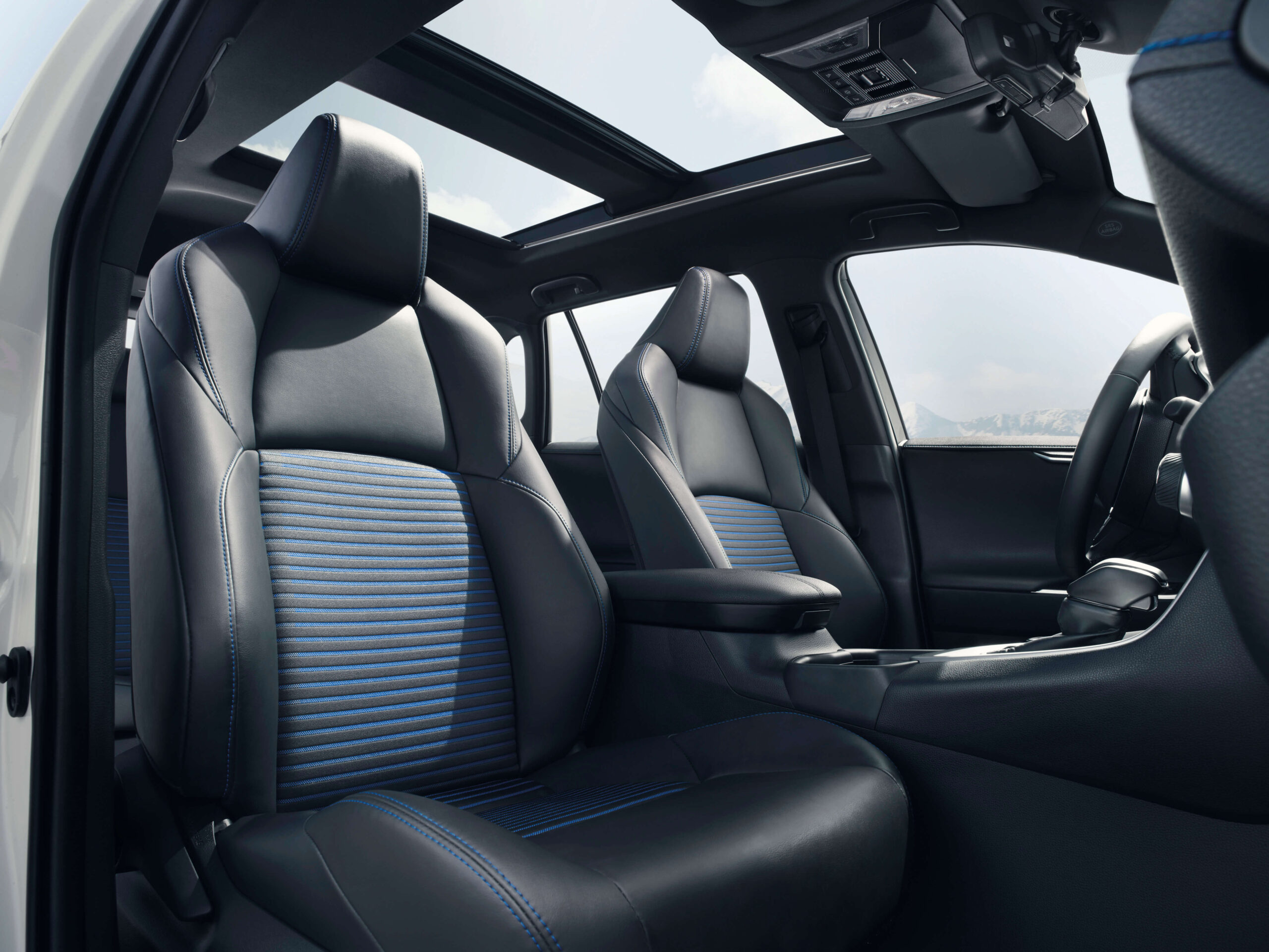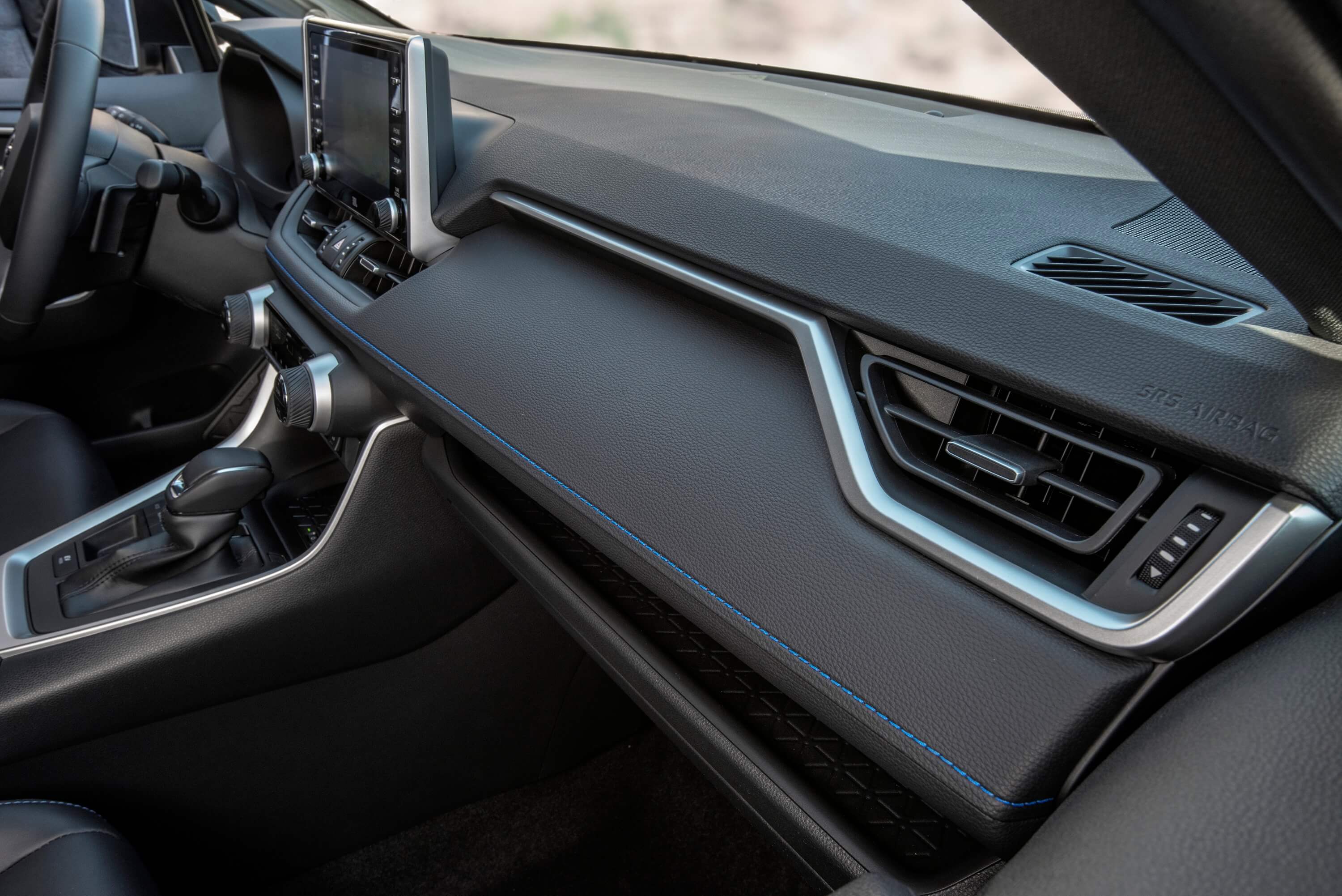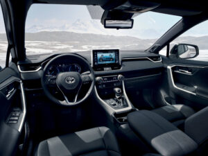 Atsisėdę vidun tokios nuostabos, kaip pirmą kartą pamatę naująjį „RAV 4“, nebepatirsite. Kai kais atrodo itin kokybiškai ir prabangiai, kaip mėlyną siūlė, tiesiausiai linija einanti nuo keleivio priekinių durų per visą prietaisų skydą iki pat vairo. Tačiau plastikiniai mygtukai išsklaido prabangos magiją, nes labiau pritiktų dvigubai pigesniems automobiliams.