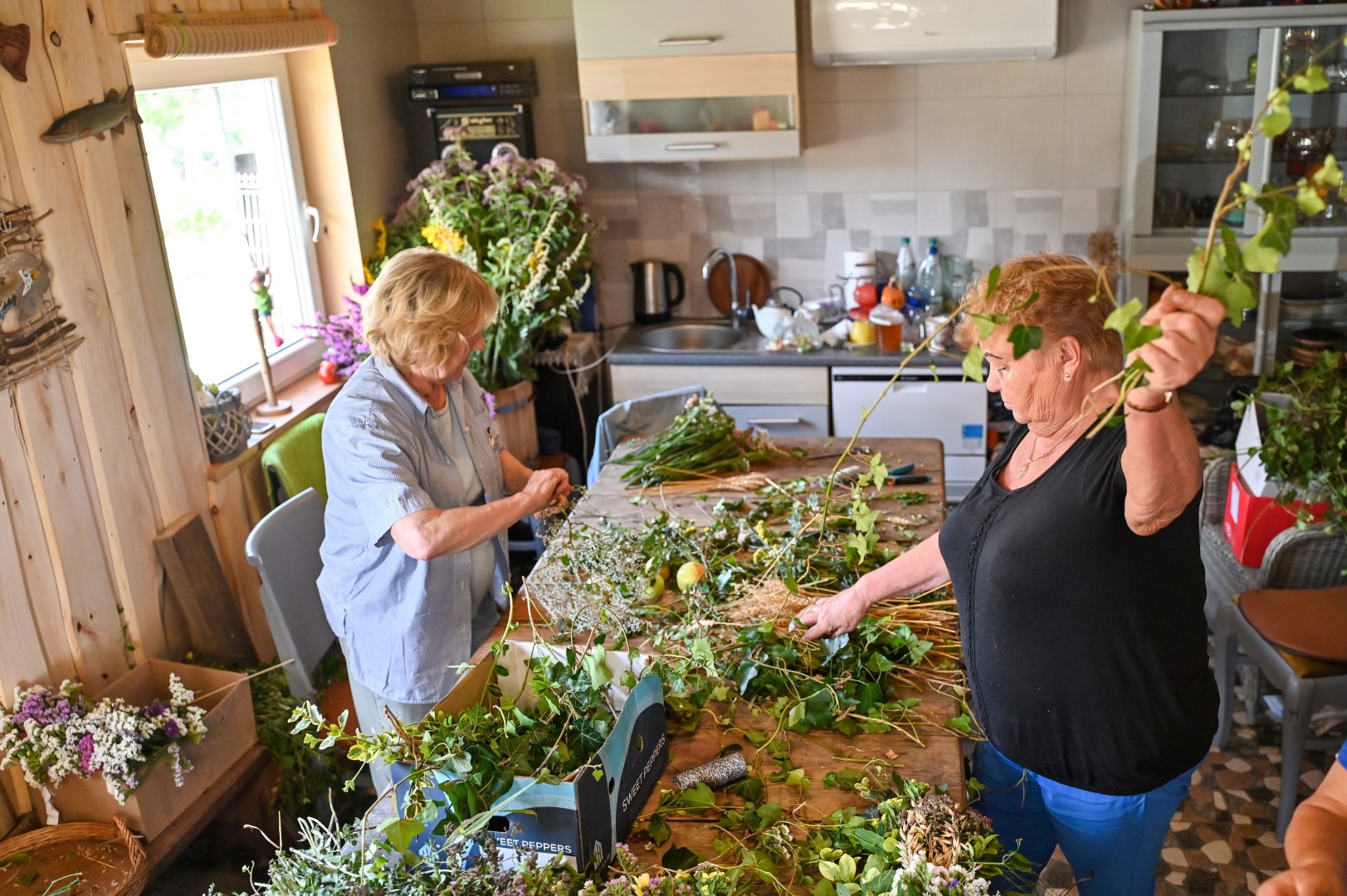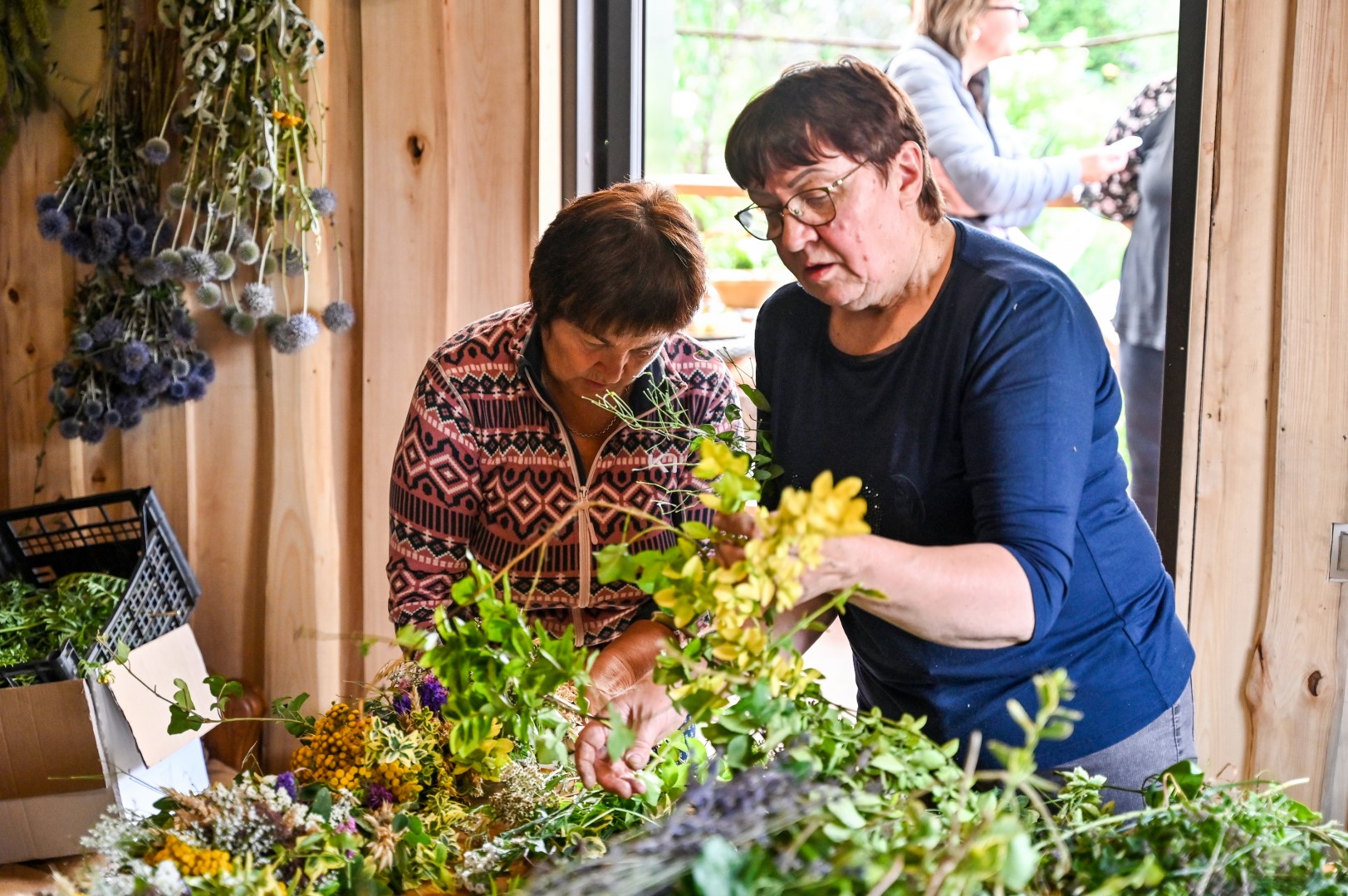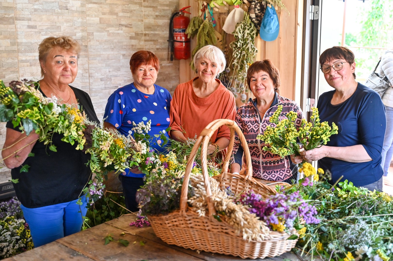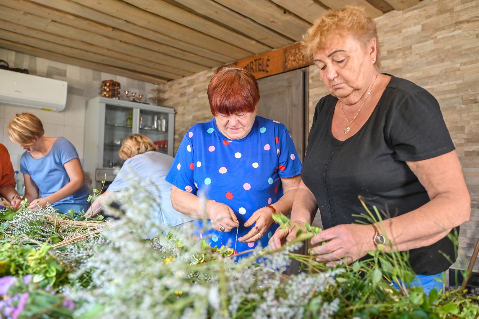 Trumpam atsitraukdamos, talkininkės pluša nuo dešimtos ryto iki dešimtos vakaro. Vienos ruošia žolynus pynimui, juos sukarpo, kitos rūpinasi trūkstamomis medžiagomis, trečios riša.