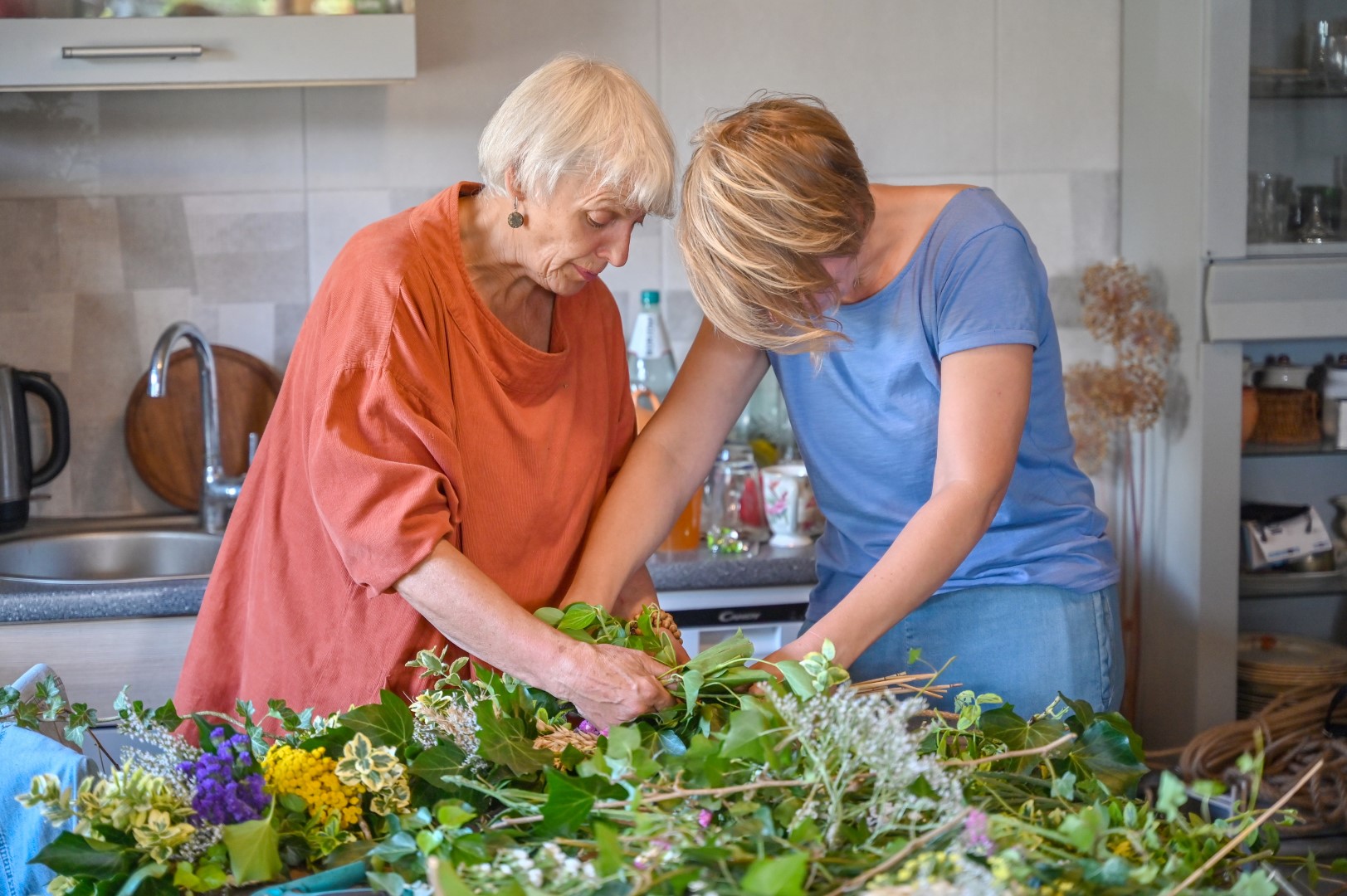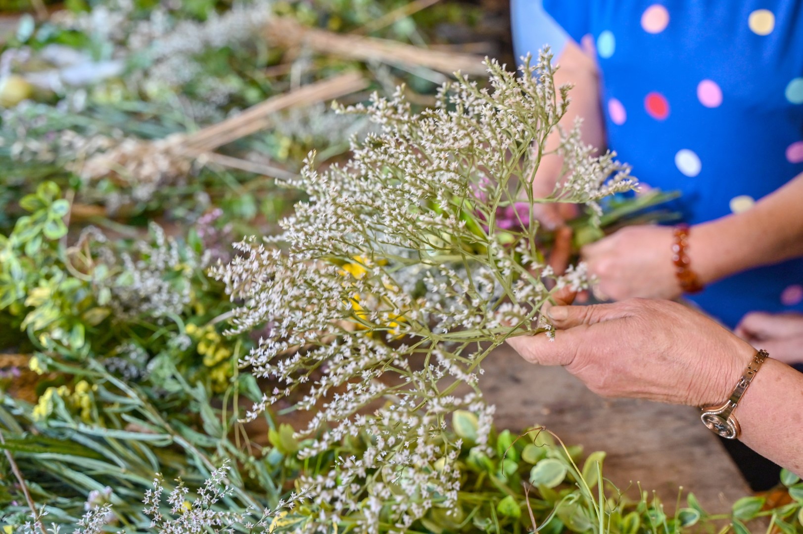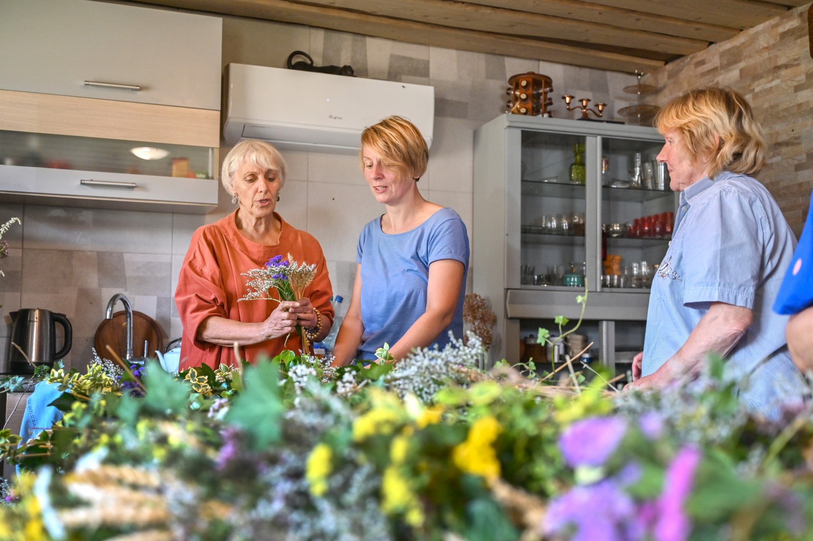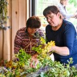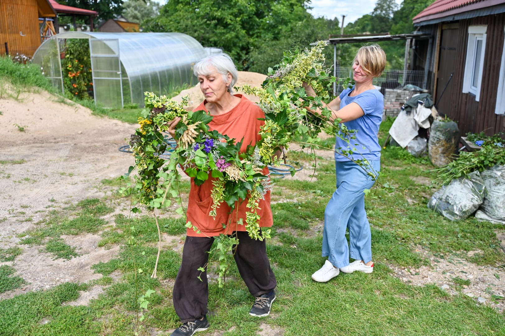 Trumpam atsitraukdamos, talkininkės pluša nuo dešimtos ryto iki dešimtos vakaro. Vienos ruošia žolynus pynimui, juos sukarpo, kitos rūpinasi trūkstamomis medžiagomis, trečios riša.