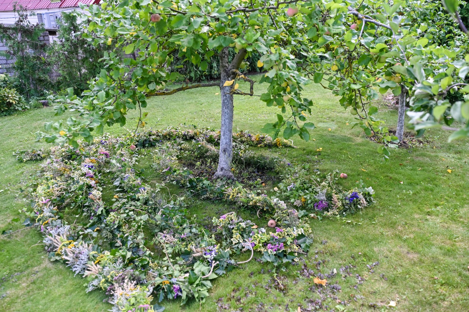 Kai lankėmės Krekenavoje ketvirtadienio popietę, jau buvo nupinta kone aštuonios dešimtys metrų įvairiaspalvių žolynų vainikų, tvarkingai suguldyti I. Rudienės sode, mat terasoje visi nebetilpo.