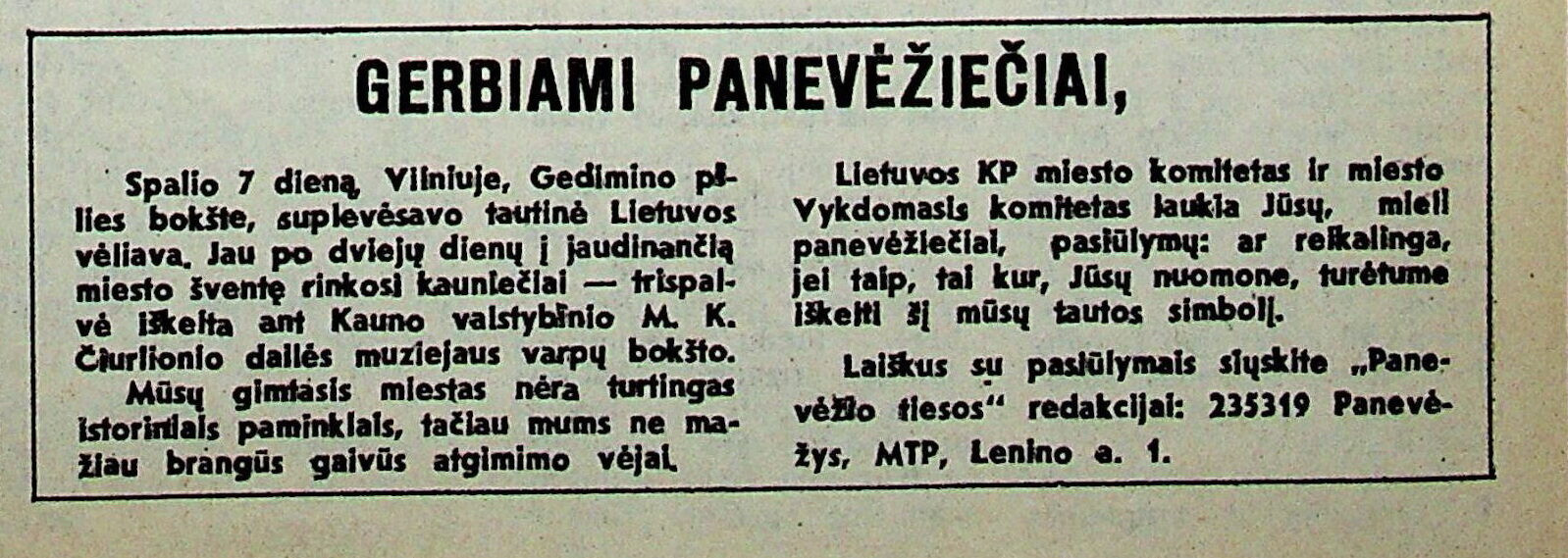 Tų metų spalį laikraštyje „Panevėžio tiesa“ išspausdintas miesto valdžios kreipimasis į panevėžiečius.