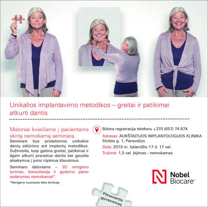 Balandžio 17 d. Aukštaitijos implantologijos klinikoje vyks nemokamas seminaras pacientams, kuriame kviečiami dalyvauti visi, kam aktuali dantų atkūrimo problema. ,,Seminaro dalyviams išsamiai papasakosime apie šią ir kitas klinikoje taikomas dantų atkūrimo metodikas, jie galės nemokamai individualiai pasikonsultuoti, išsitirti savo burnos būklę,“ – atvykti į nemokamą renginį kvietė A. Navikienė.