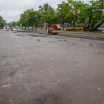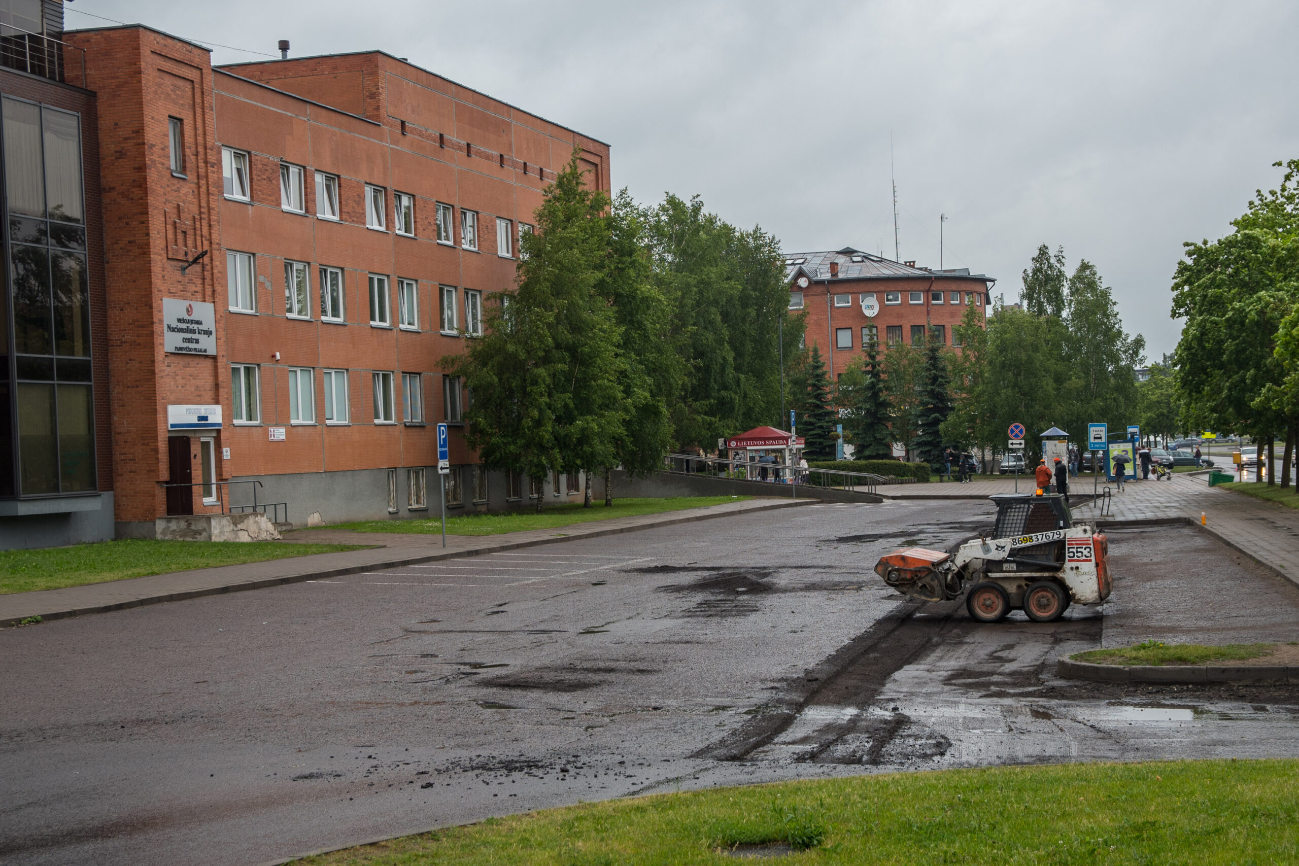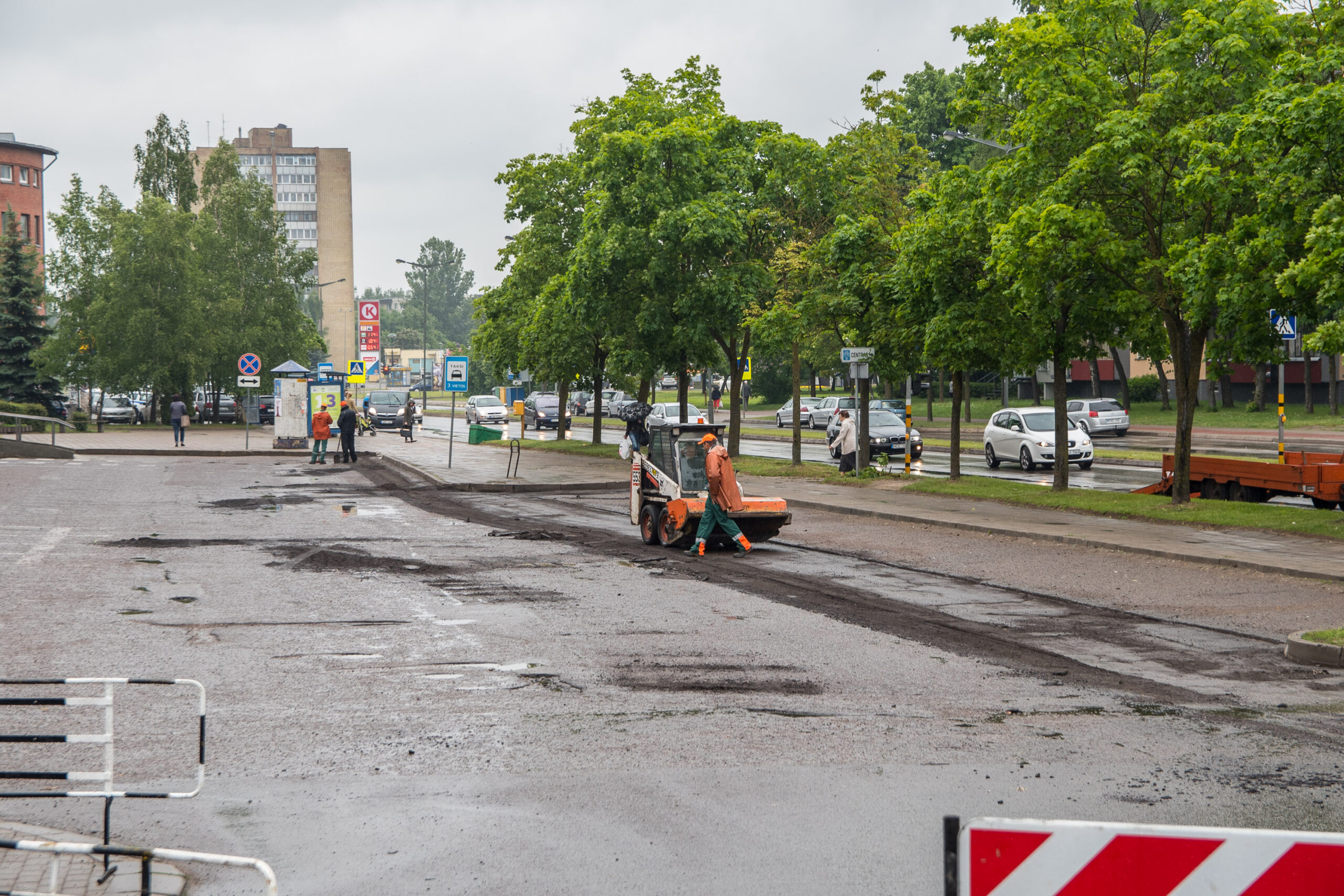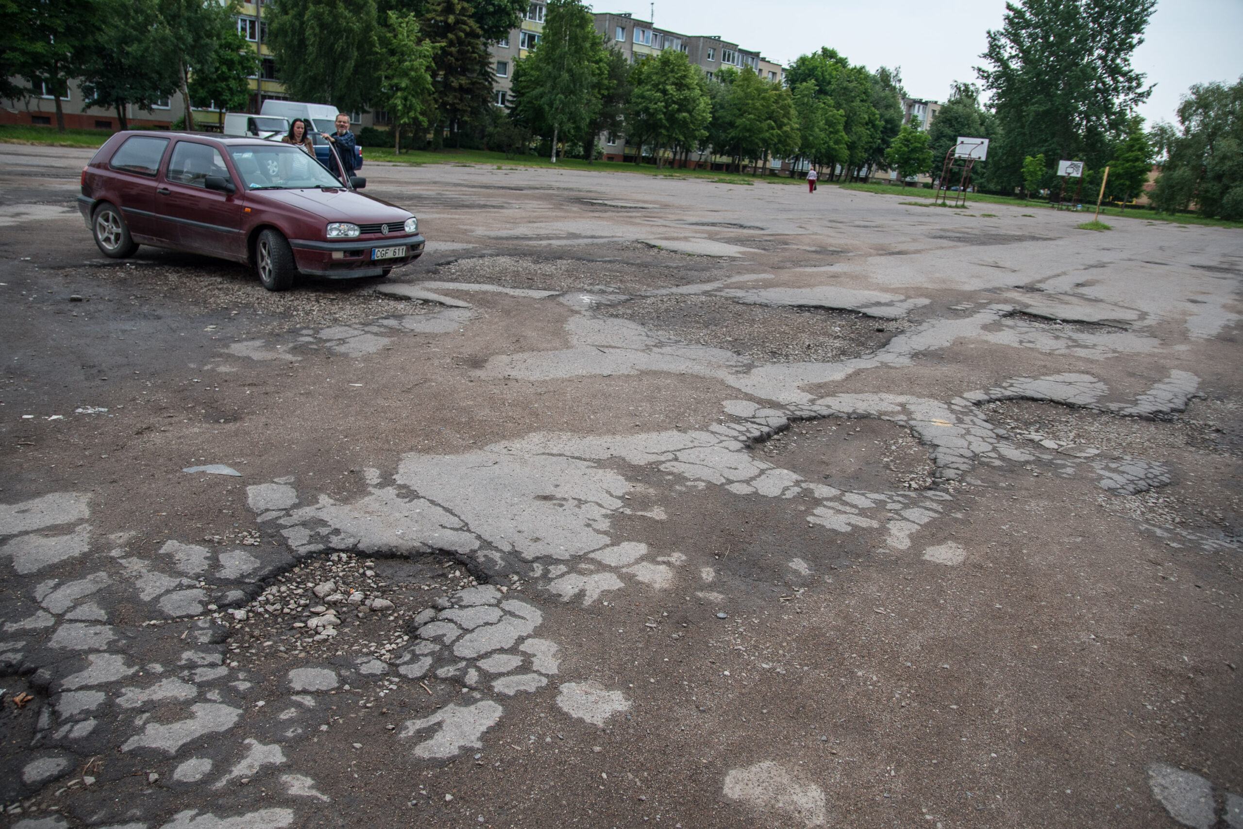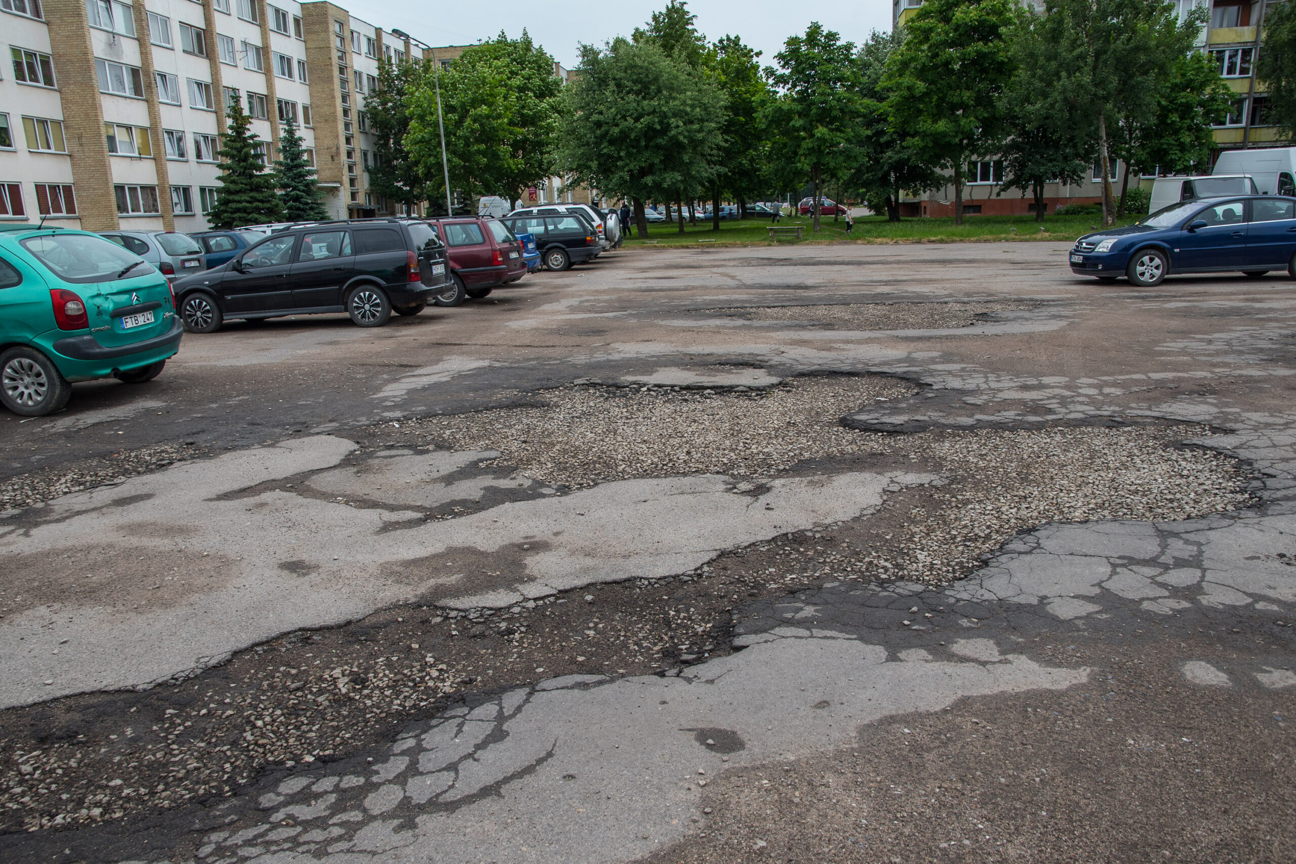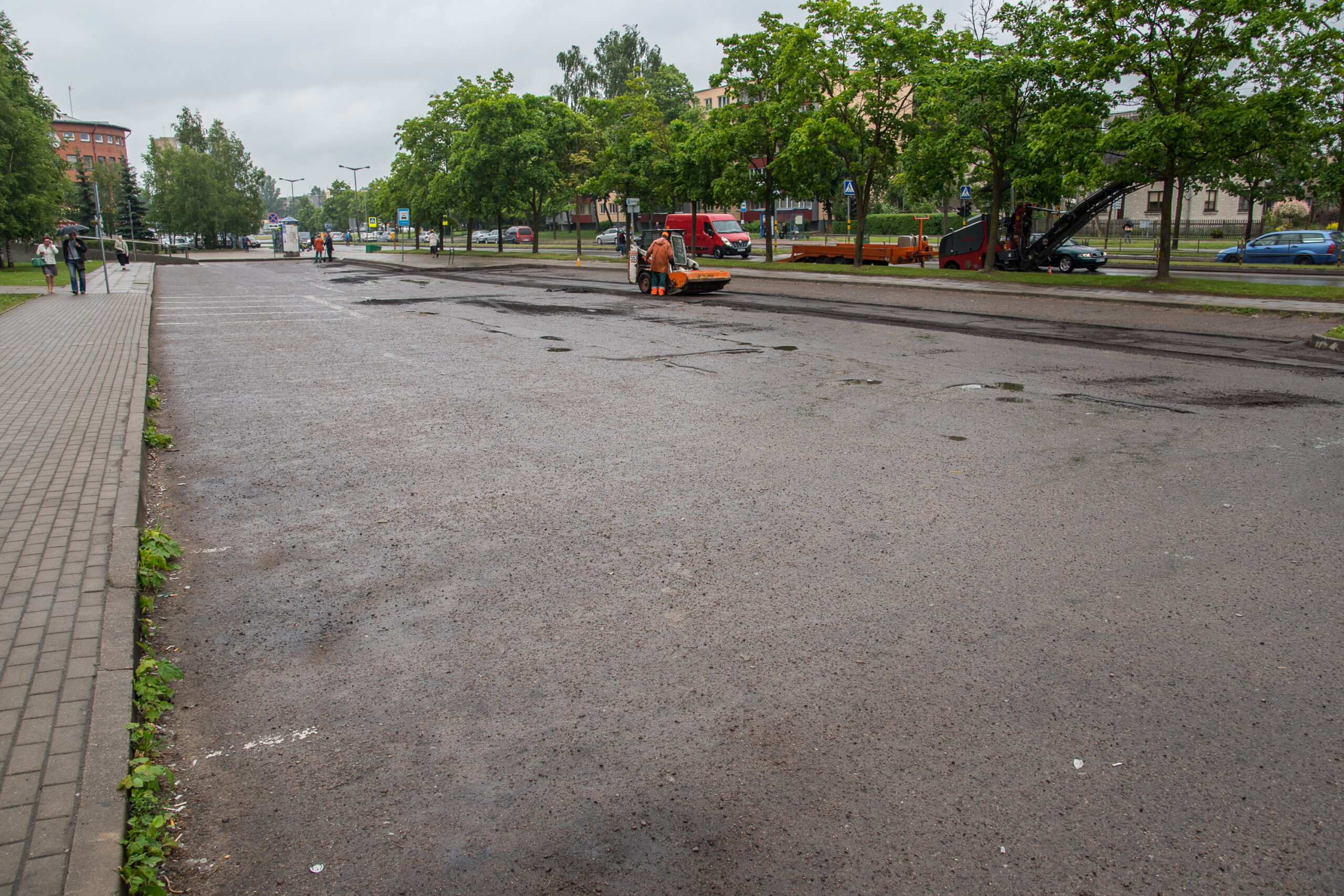 Viena tokių įvažų dabar lopoma prie Panevėžio miesto poliklinikos Nemuno gatvėje, automobilių stovėjimo aikštelėje. Čia nuo paties ryto vietomis nugremžtas viršutinis asfalto dangos sluoksnis ir klojamas naujas asfaltas.