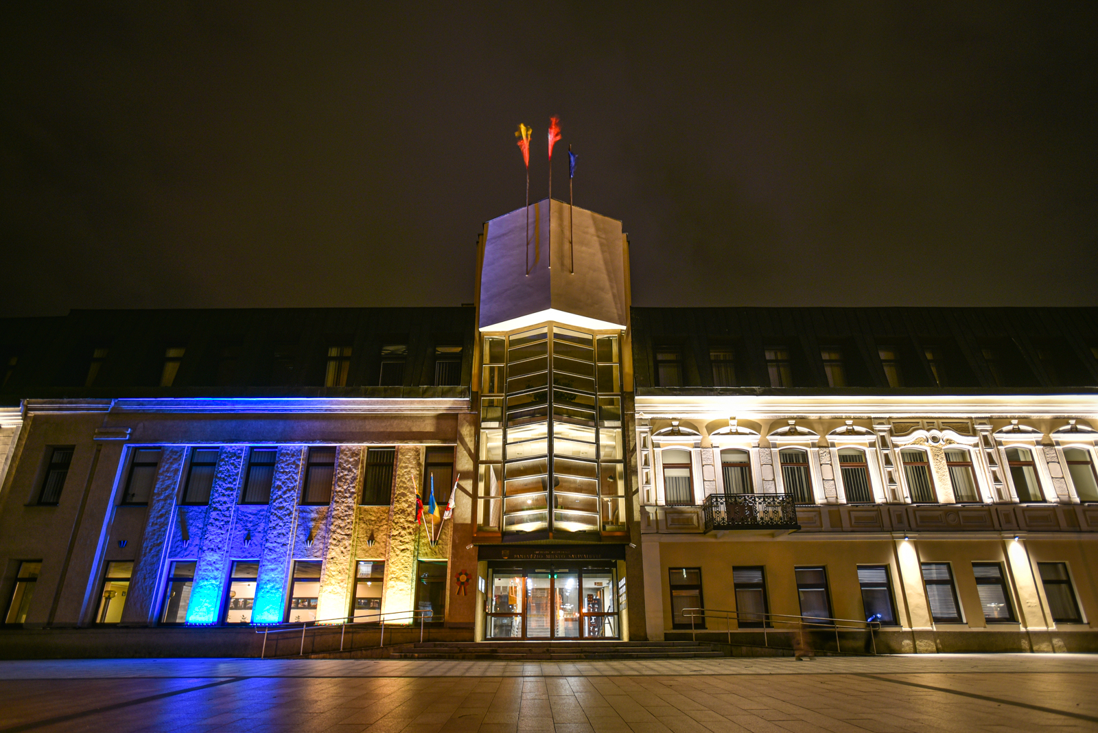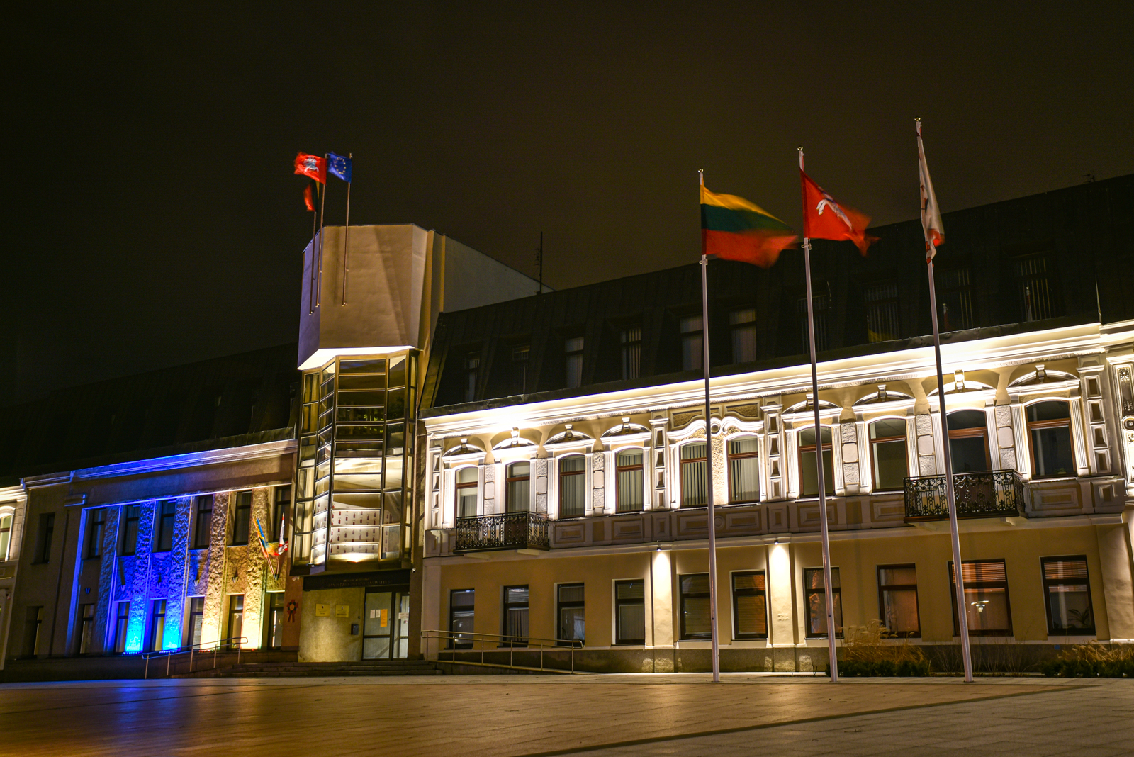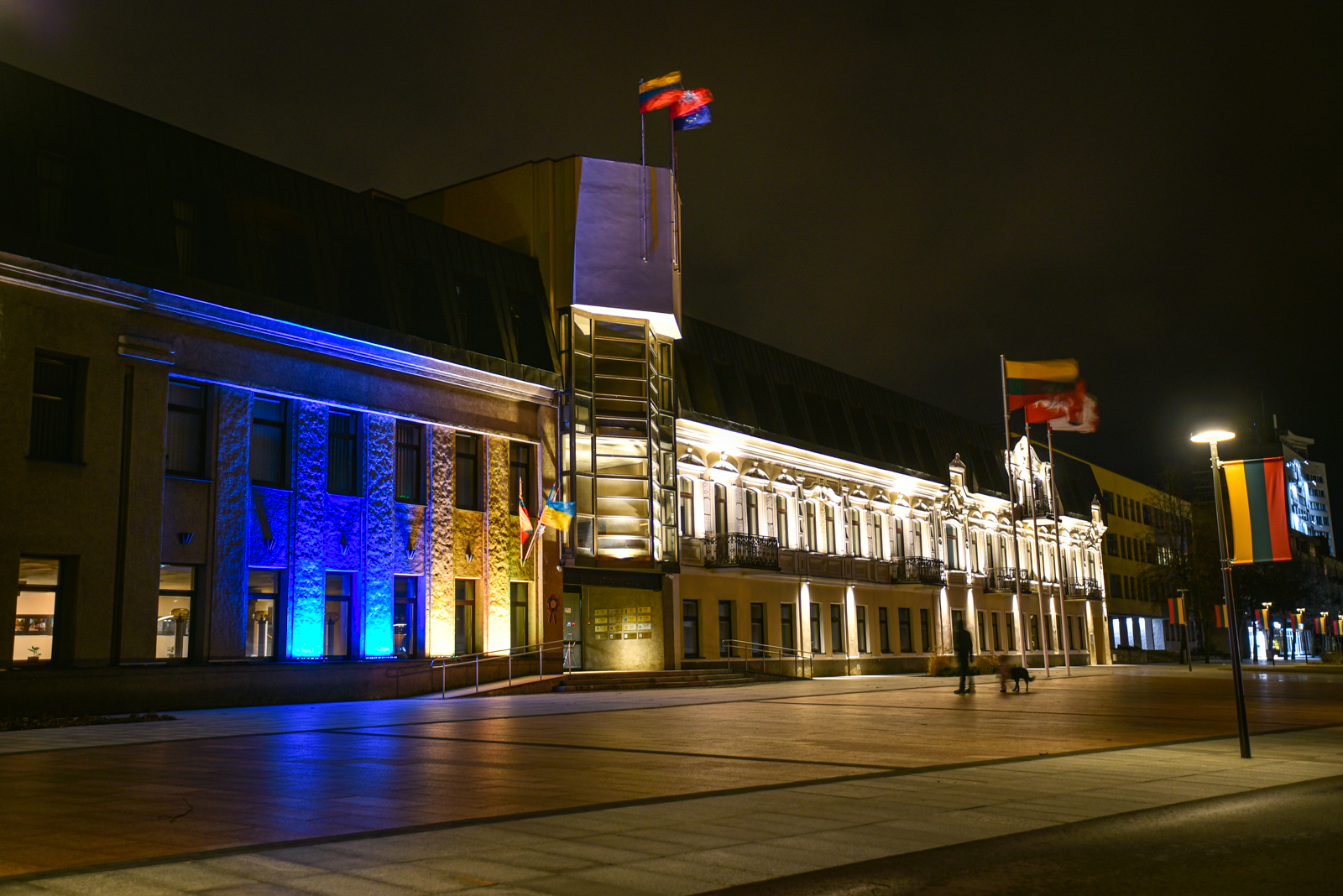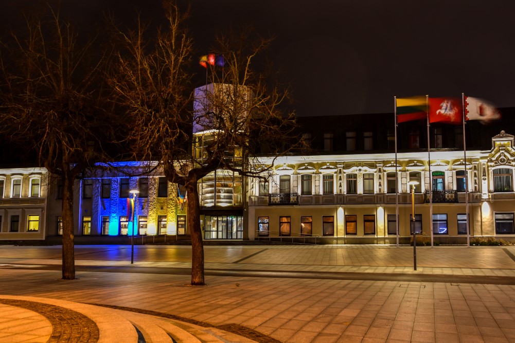 Panevėžio savivaldybės pastatą Laisvės aikštėje ketvirtadienio vakarą nušvietė simbolinė instaliacija – Ukrainos vėliavos spalvos, o ant paties pastato pakelta Ukrainos nacionalinė vėliava.