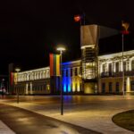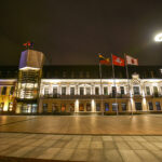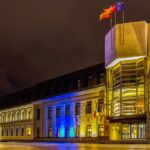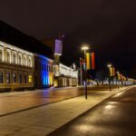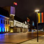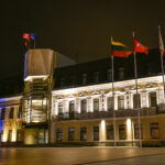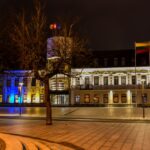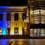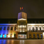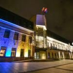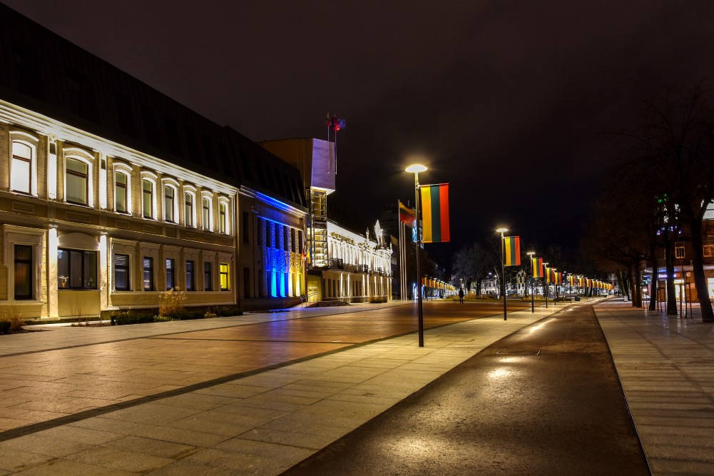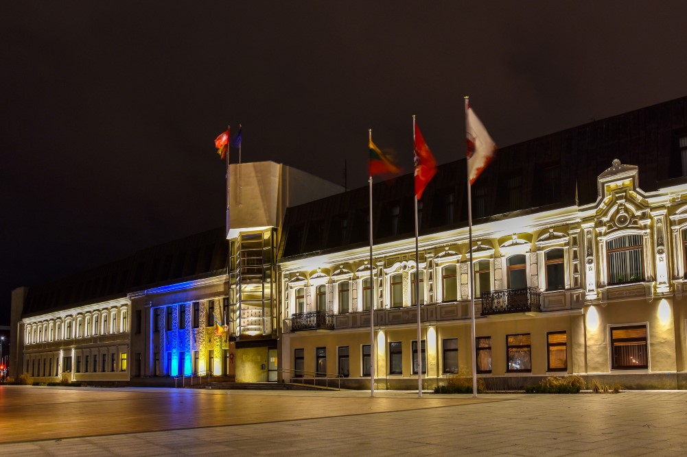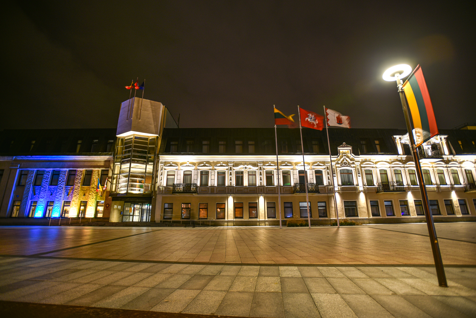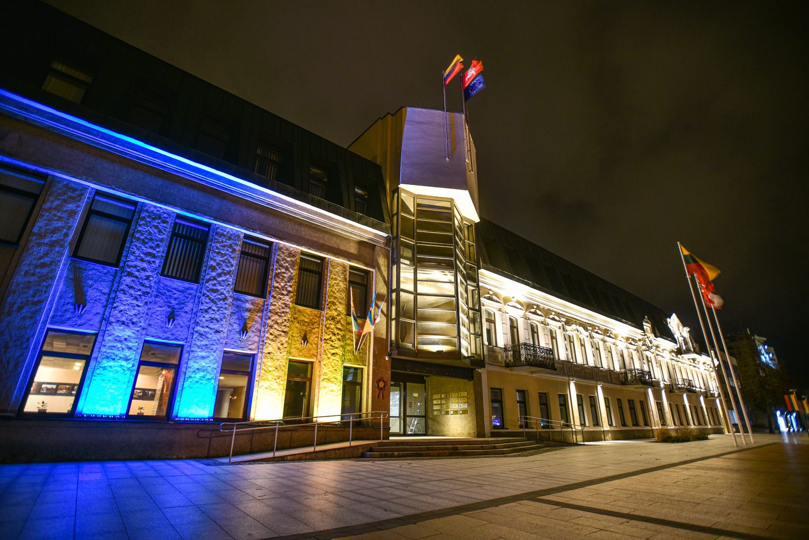Panevėžio savivaldybės pastatą Laisvės aikštėje ketvirtadienio vakarą nušvietė simbolinė instaliacija – Ukrainos vėliavos spalvos, o ant paties pastato pakelta Ukrainos nacionalinė vėliava.