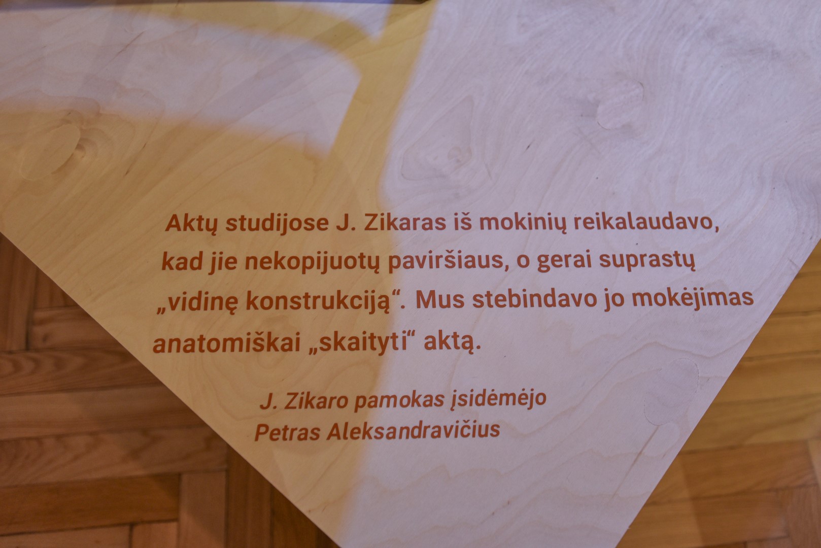 „Skulptoriai tvirtina, kad studijuojant skulptūros meną šiomis dienomis gana mažai mokoma anatomijos. O štai Peterburge skulptūrą studijavęs J. Zikaras žmogaus anatomiją buvo itin gerai išstudijavęs. Mokydamas kitus kurti, jis pabrėždavo, kad skulptūroje vaizduojami raumenys turi būti „įdarbinti“, o kūrėjas turi jausti netgi kaulus, esančius po tais raumenimis“, – pasakoja J. Gaidelienė.