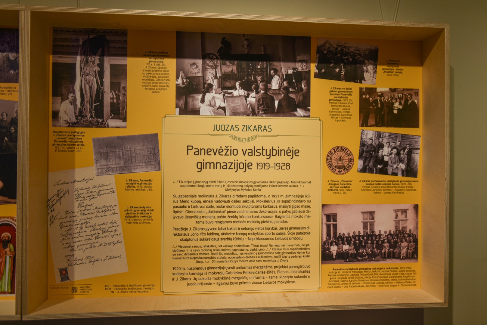 J. Gaidelienė pasakoja, kad iš mokslų Peterburgo dailės akademijoje gimtinėn grįžęs diplomuotas skulptorius J. Zikaras iškart Panevėžyje negavo darbo. Teko luktelėti, kol buvo įdarbintas dailės pedagogu valstybinėje gimnazijoje, dabar turinčioje Juozo Balčikonio vardą. Tapęs mokytoju, J. Zikaras labai aktyviai ėmėsi pedagoginės veiklos, kibo į kūrybą. O kadangi neturėjo studijos, kūrybinė erdvė jam buvo įrengta atskyrus dalį mokyklos sporto salės.