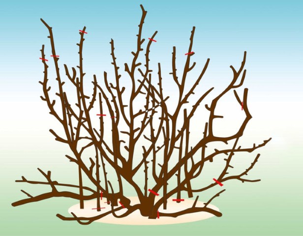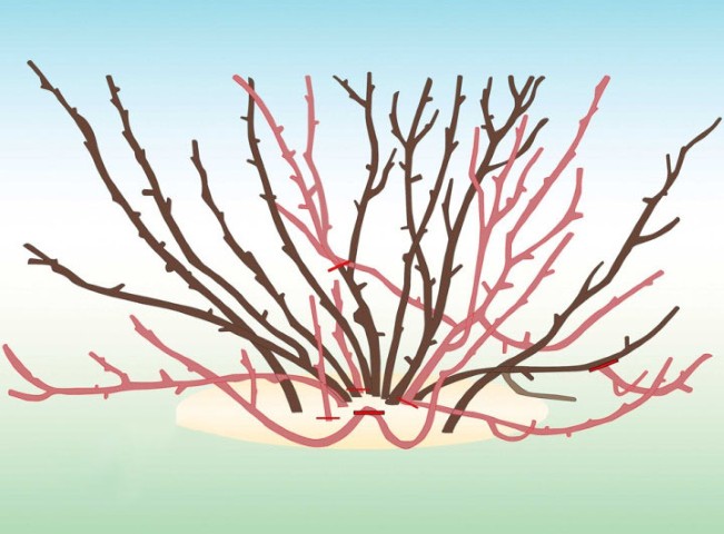 Jeigu krūmą atėjo metas retinti, sveikus ūglius su stipriu metiniu prieaugiu tik patrumpinkite iki artimiausio gerai išsivysčiusio pakaitinio ūglio.