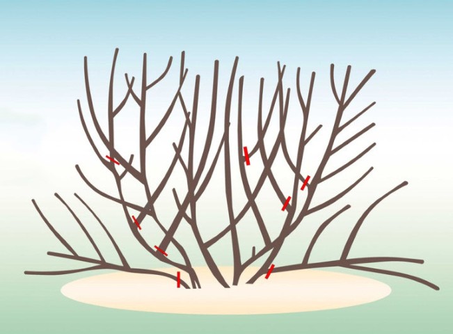Jau nuderėjusios šakelės sutrūkinėjusia žieve, senesnės kaip 5 metų, patrumpinamos iki gerai išsivysčiusio jauno ūgliuko. Bet jeigu jos užtankina krūmą, kirpkite nedvejodami prie pagrindo.