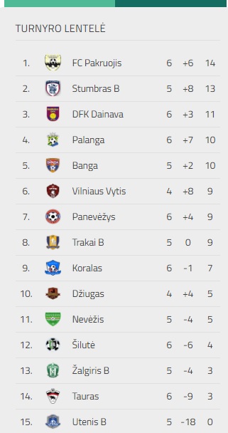 Po pergalės FK „Panevėžys“ pakilo į 7-tą vietą – 9 taškai. Lygoje pirmauja FK „Pakruojis“ – 14 taškų (po 6 rungtynių), antras žengia „Stumbras B“ – 13 taškų, tačiau kauniečiai sužaidę 5 rungtynes, 3-ioje vietoje – Alytaus DFK „Dainava“ (11 taškų, 6 rungtynės).
