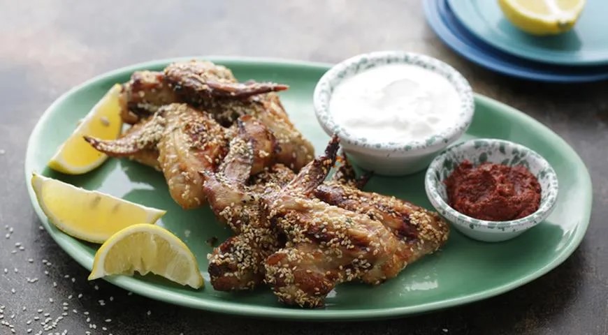 Reikės (3–4 porcijoms): 1 kg viščiukų sparnelių, 1 šaukšto bekvapio alyvuogių aliejaus, 1 šaukšto sezamų aliejaus, 1 šaukšto šviežių smulkintų raudonėlių, 2 citrinų, 2 šaukštų skrudintų sezamų sėklų, 4 šaukštų medaus; patiekti: 1 citrinos, 1 stiklinės jogurto ir chariso – aštraus paprikų padažo (nebūtina).
