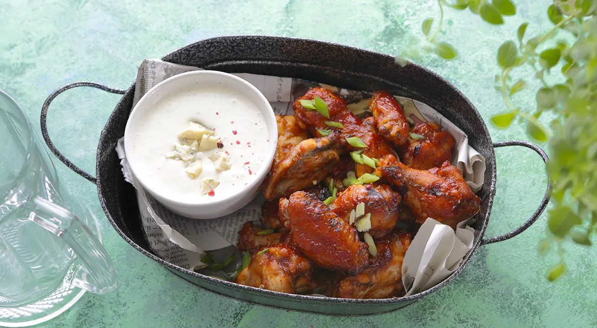 Reikės: 1 kg viščiukų sparnelių, 1 šaukšto alyvuogių aliejaus, 4 salierų stiebų, ridikėlių ryšelio; aštriam padažui: 150 g kečupo, 100 ml obuolių acto, 100 ml viskio, 4 šaukštų tamsaus cukranendrių cukraus, 2 šaukštų aitriųjų paprikų padažo (jeigu „Tabasco“, tai kiek mažiau), 1 šaukšto Vorčesterio padažo, 1 šaukštelio maltų kuminų, 1 šaukštelio maltų kalendrų, 1 šaukštelio rūkytų paprikų dribsnių, 1 šaukšto sviesto; sūrio padažui: 100 g bet kokio sūrio su mėlynuoju pelėsiu, 150 g grietinės, 50 g majonezo, citrinos sulčių, druskos, šviežiai maltų juodųjų pipirų.