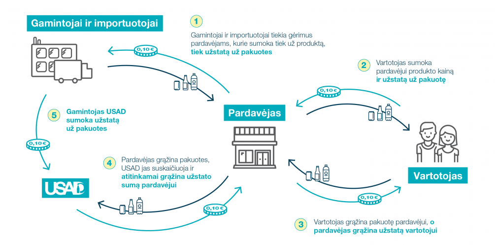 10 ct užstatą už gėrimo pakuotę sumokame pardavimo vietoje. Tačiau tai nereiškia, kad jį toje pat vietoje ir atsiimsime. Todėl mūsų užstatas, kartu su kitomis pardavimo pajamomis, iš parduotuvės keliauja pas gėrimų gamintoją. Pastarasis, iš savo pajamų atskyręs užstato dalį, jį perduoda USAD, kuris mūsų užstatą išskirsto parduotuvėms. Bet tik toms, kuriose galima grąžinti pakuotes, ir tik tiek, kiek pakuočių visi drauge čia grąžinome.