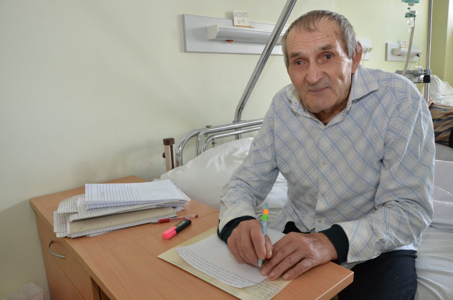 Toje pačioje palatoje gulintys vyrai sako, kad K. Viederis protingiausias iš visų čia gulinčiųjų. „Jis rašo ir rašo, pasivaikščioja dešimt minučių ir vėl rašo. O atmintis jo kokia… pripasakojo mums įvairiausių istorijų. Mes kartais neatsimenam, ką veikėm vakar, o Kostas viską gali papasakoti minučių tikslumu, net ir tuos dalykus, kurie vyko prieš daugelį metų“, – „Sekundei“ tvirtino palatos draugai.
