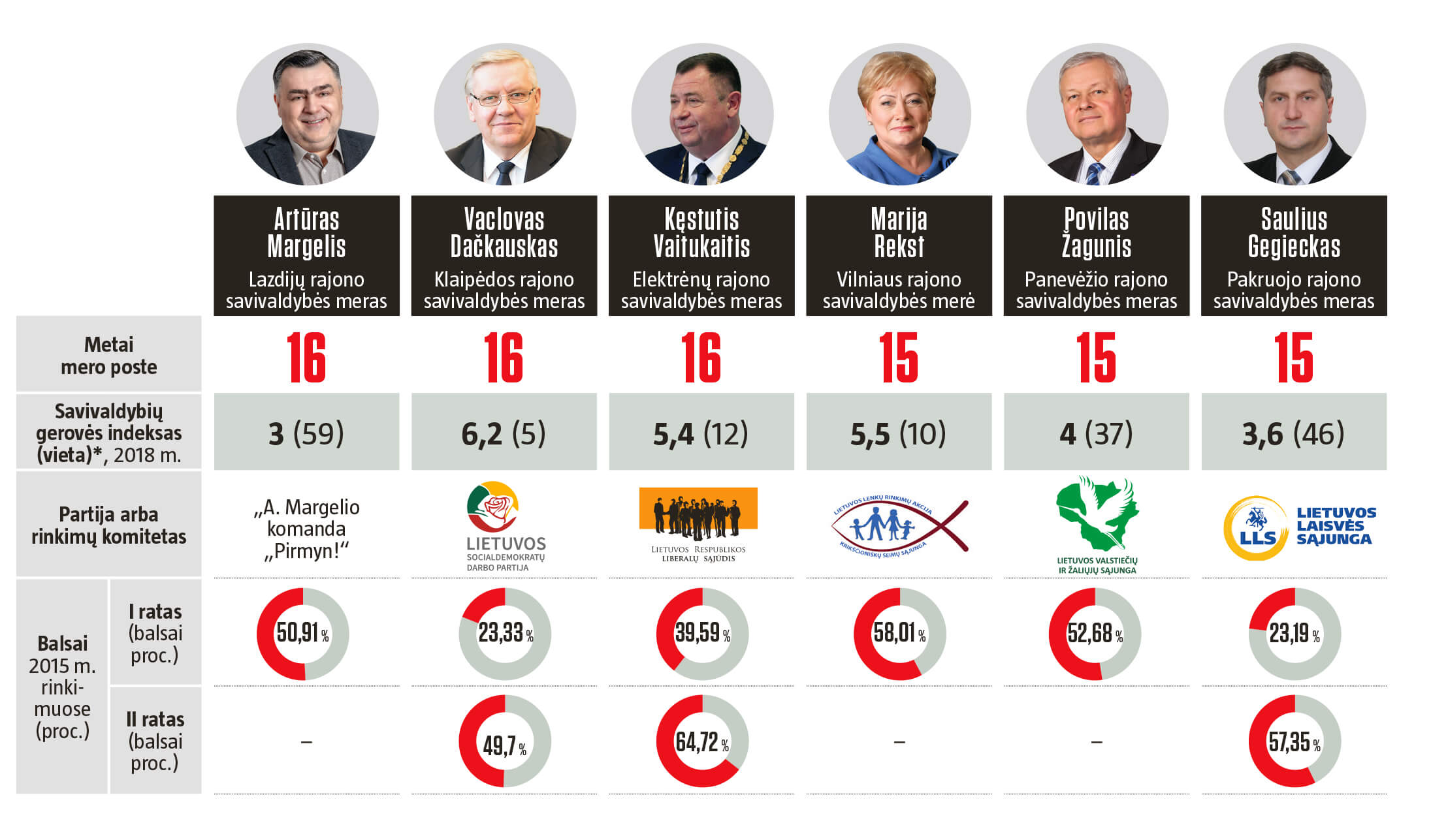 Pirmą kartą 2015 m. įvykę tiesioginiai merų rinkimai savivaldybių vadovus padalijo į beveik lygius trečdalius. Pirmasis – nauji politikai, antrasis – jau patirties turintys merai. Trečia grupė – svarbiausiose kėdėse dviženklį metų skaičių sėdintys vadovai.