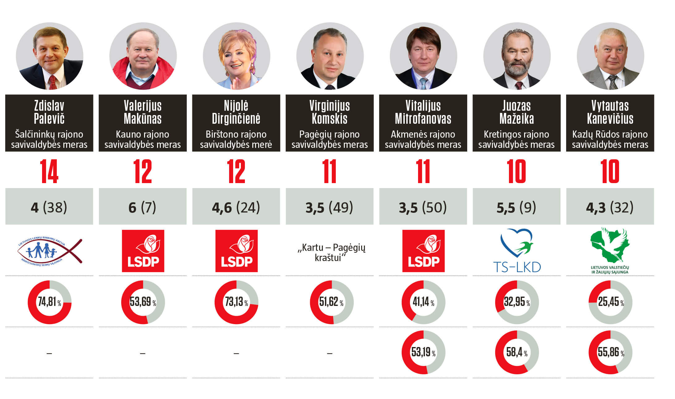 Vis dėlto, trys blogiausią įvertinimą gavusios savivaldybės šią taisyklę tarsi patvirtina. 16 metų Artūro Margelio valdomas Lazdijų rajonas sąraše yra priešpaskutinis. Paskutinėje vietoje atsidūrusiai Zarasų rajono savivaldybei 2015 m. postą praradęs Arnoldas Abramavičius su pertraukomis vadovavo 11 metų. Ignalinos savivaldybė užima trečią vietą nuo galo. Dabartinis meras Henrikas Šiaudinis dirba tik penktus metus. Tačiau prieš jį savivaldos mohikanas, vienas Lietuvos valstiečių ir žaliųjų sąjungos lyderių Bronis Ropė meru išdirbo 19 metų, po to buvo išrinktas į Europos Parlamentą.
