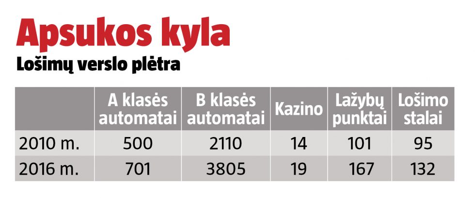 Pastaraisiais metais kiek traukėsi tik lažybų punktų tinklas, tačiau ne pačių lažybų apimtis – jų apyvarta didėjo internete (pernai pasiekė 216 mln. eurų), o antžeminiuose punktuose menko (138 mln. eurų). Lošimams skirtų vietų per pastaruosius šešerius metus gerokai padaugėjo, labiausiai augo B kategorijos lošimo aparatų skaičius, buvo atidaryti penki nauji kazino (žr. lentelę). Tačiau penkiolikoje šalies savivaldybių nėra nei žaidimų automatų salonų, nei kazino, nei lažybų punktų.