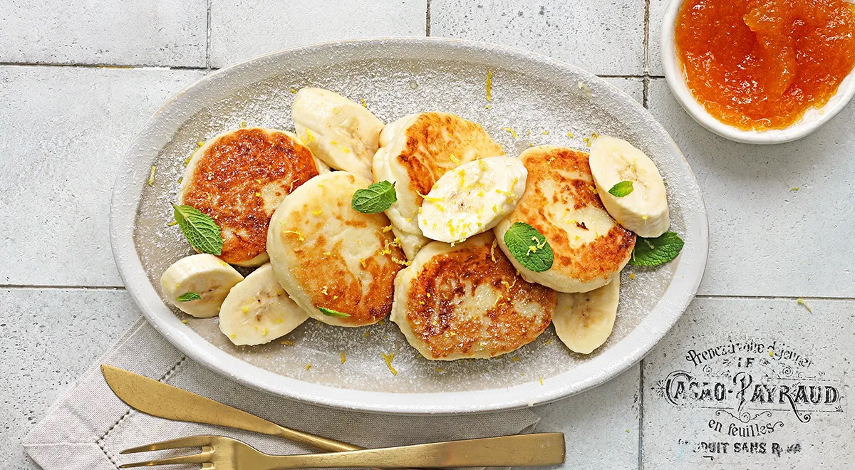 Per tą laiką nulupkite bananus, supjaustykite stambiais skridinėliais. Patiekite juos su iškepusiais varškėčiais, pabarstytais milteliniu cukrumi arba apšlakstytais medumi ir papuoštais mėtų lapeliais.