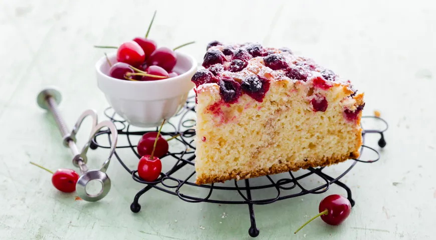 Supilkite pusę tešlos į formą, išlyginkite. Vyšnias apvoliokite krakmolo ir 2 šaukštų cukraus mišinyje. Maždaug trečdalį jų sudėkite ant tešlos, užberkite 1 šaukštu cukraus ir, sukrėtę likusią tešlą, vėl išlyginkite paviršių, papuoškite vyšnių likučiu, pabarstykite cukrumi.