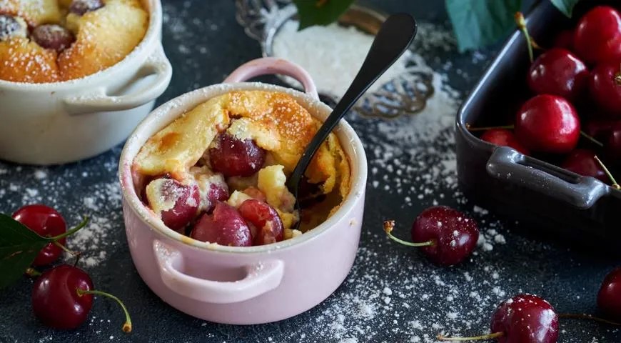 Sutepkite sviestu porcijinius kepimo indelius, pridėkite trešnių, užpilkite tešla. Pašovę iki 200 laipsnių įkaitinton orkaitėn, kepkite 10 minučių, tada išimkite.