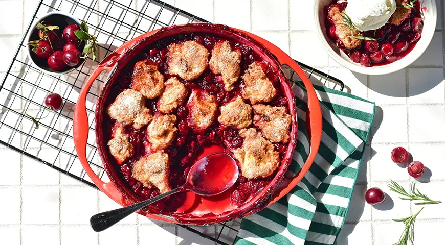 Reikės (6 porcijoms): įdarui: 750 g vyšnių be kauliukų, 180 g cukraus, 500 ml vyšnių sulčių, 3 šaukštų kukurūzų krakmolo, 2 šakelių šviežių rozmarinų, 0,25 šaukštelio druskos; tešlai: 210 g kvietinių miltų, 50 g cukraus, 1,5 šaukštelio kepimo miltelių, 0,25 šaukštelio sodos, 180 ml rūgpienio, 60 g sviesto; papildomai: 2 šaukštų cukraus, vanilinių ledų, kelių rozmarino lapelių.