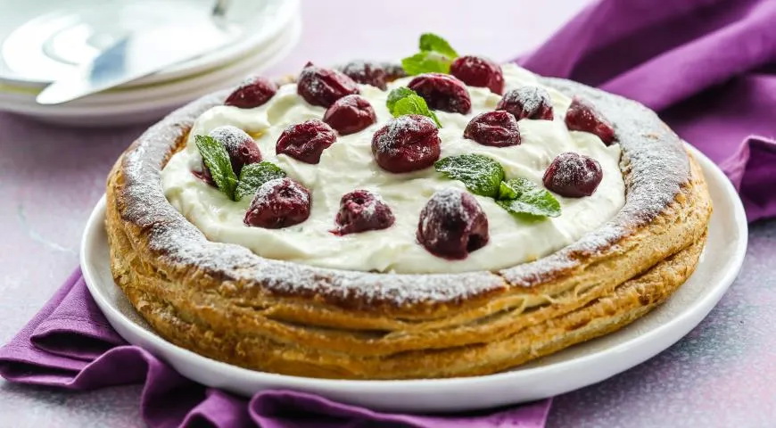 Reikės (10 porcijų): 500 g šaldytos sluoksniuotos mielinės tešlos, 200 g vyšnių, 1 kiaušinio trynio, sviesto, miltelinio cukraus, 2–3 mėtų šakelių; kremui: 1 kiaušinio, 3 kiaušinių trynių, 340 ml pieno, 4 šaukštų cukraus, 2 šaukštų miltų, 2 šaukštų kukurūzų krakmolo, 200 ml plakamosios grietinėlės.