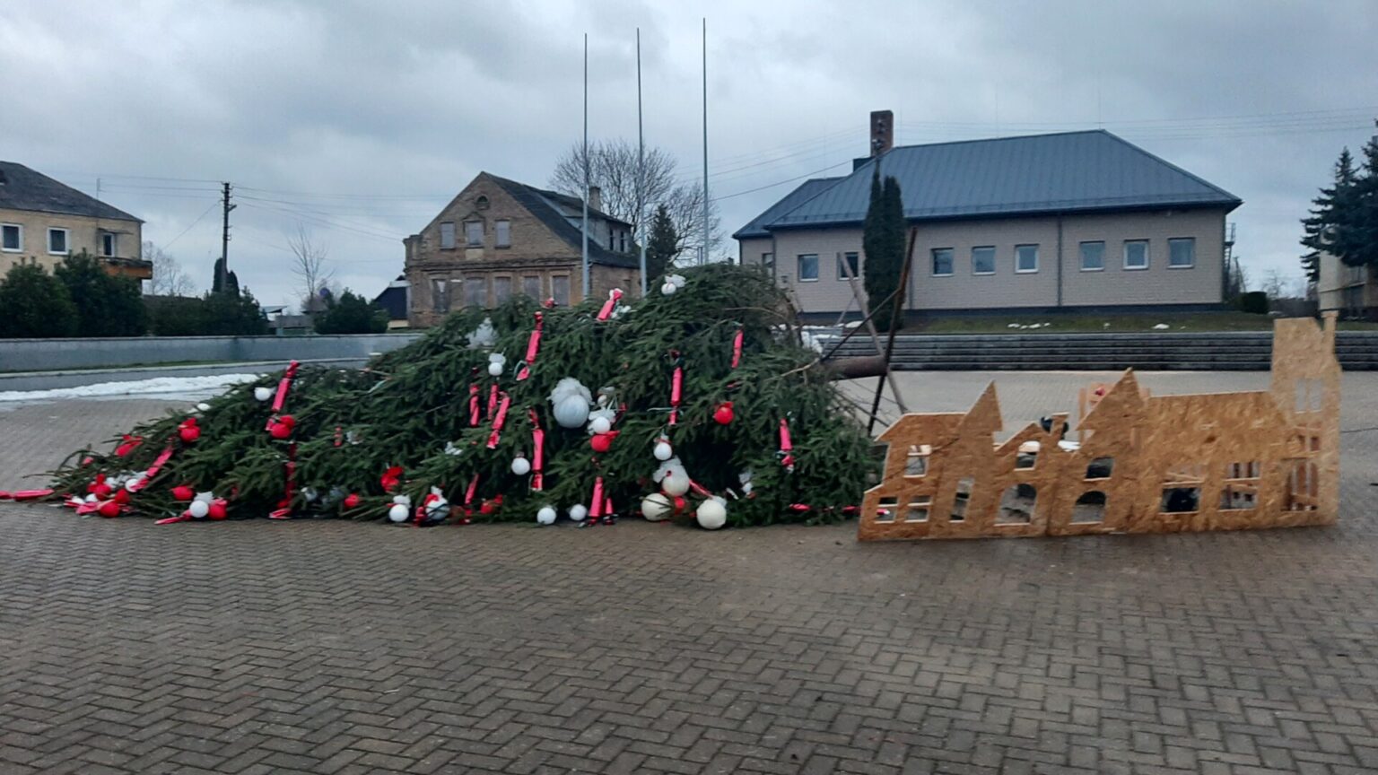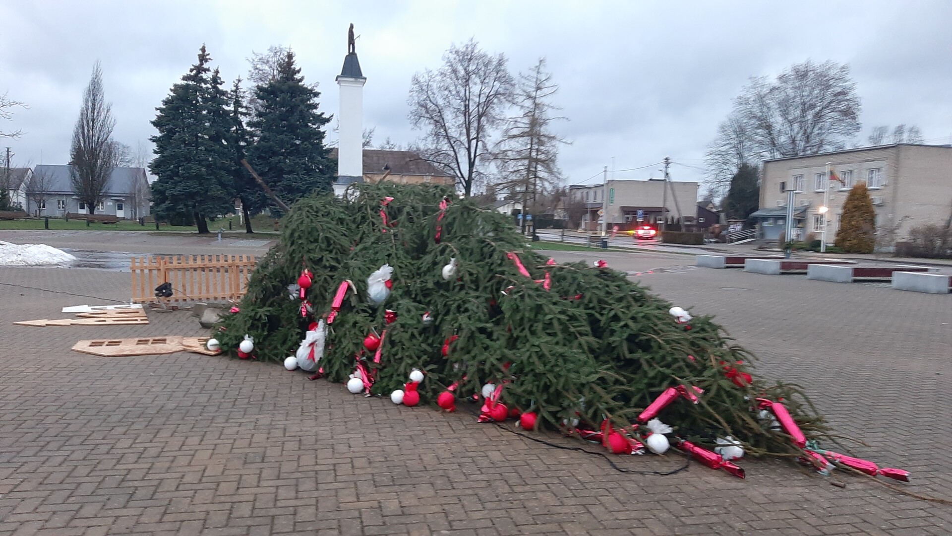 Pagrindinė Panevėžio rajono eglė, šįmet pastatyta Raguvoje, neatlaikė įsišėlusio vėjo ir jau pirmąją 2023-iųjų dieną griuvo ant šono.
