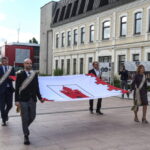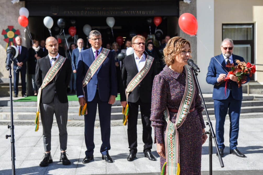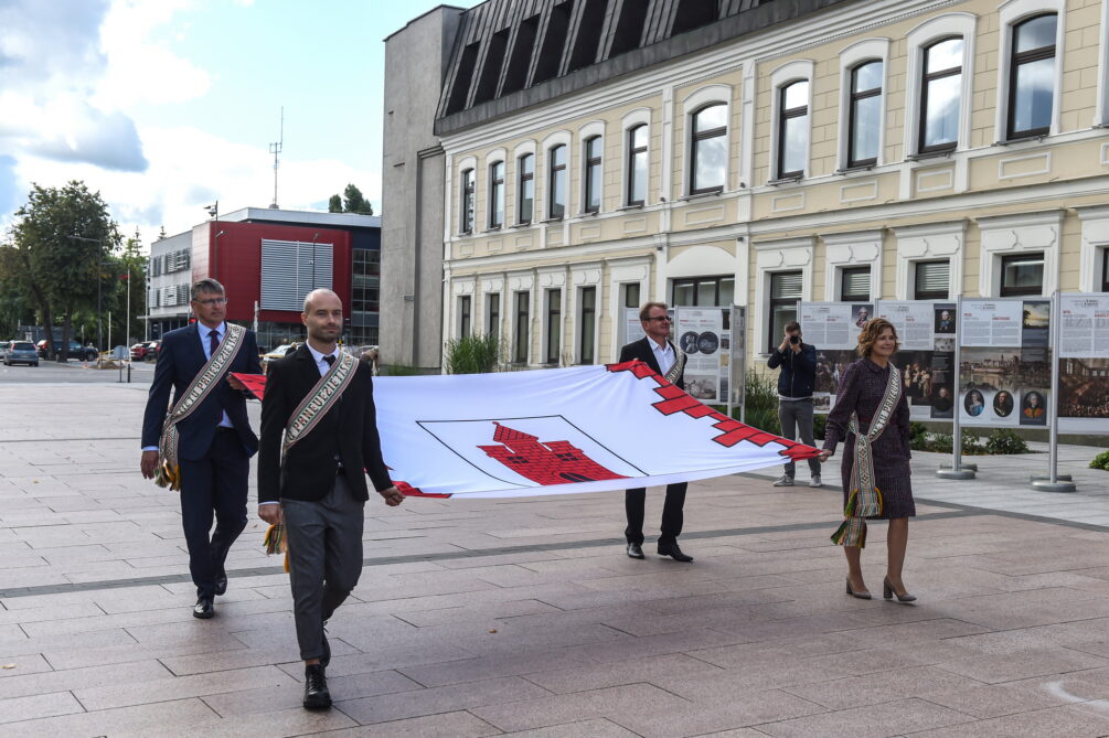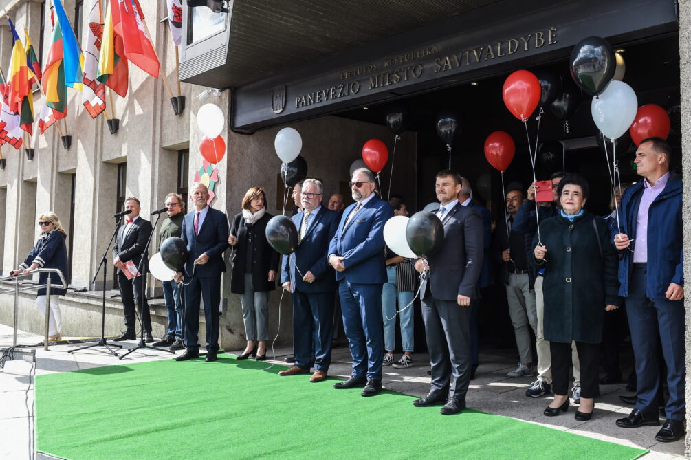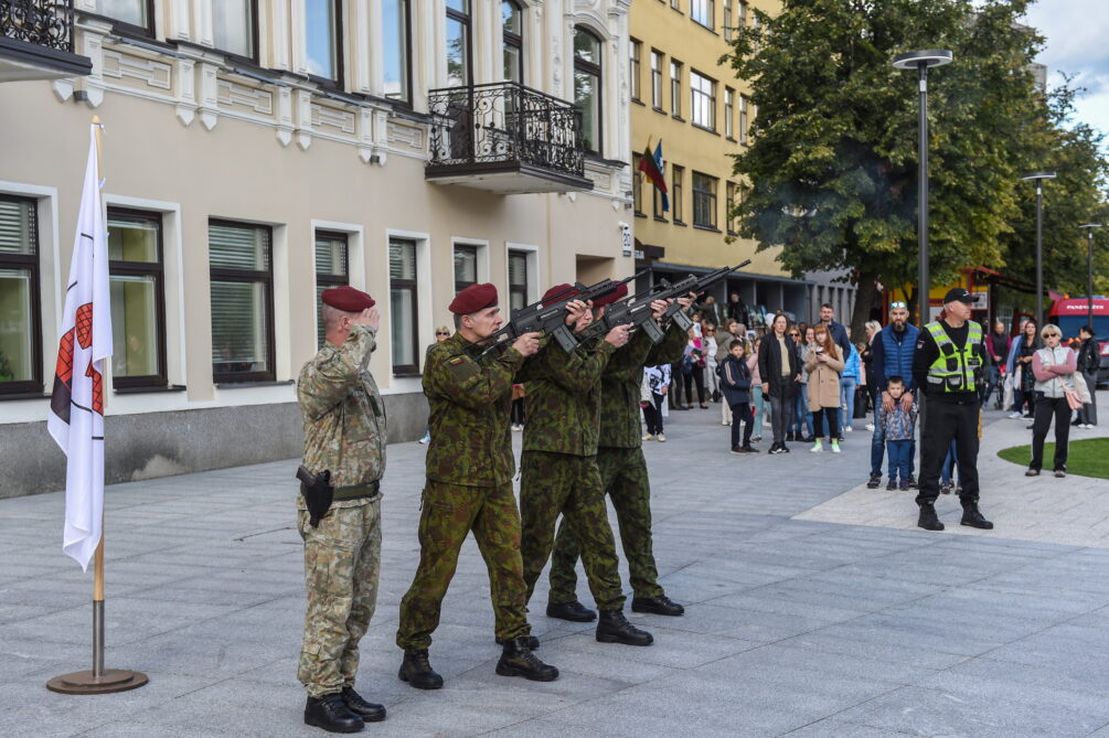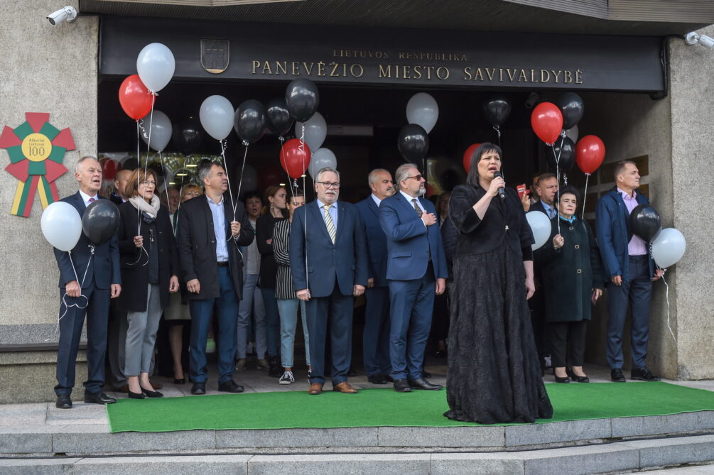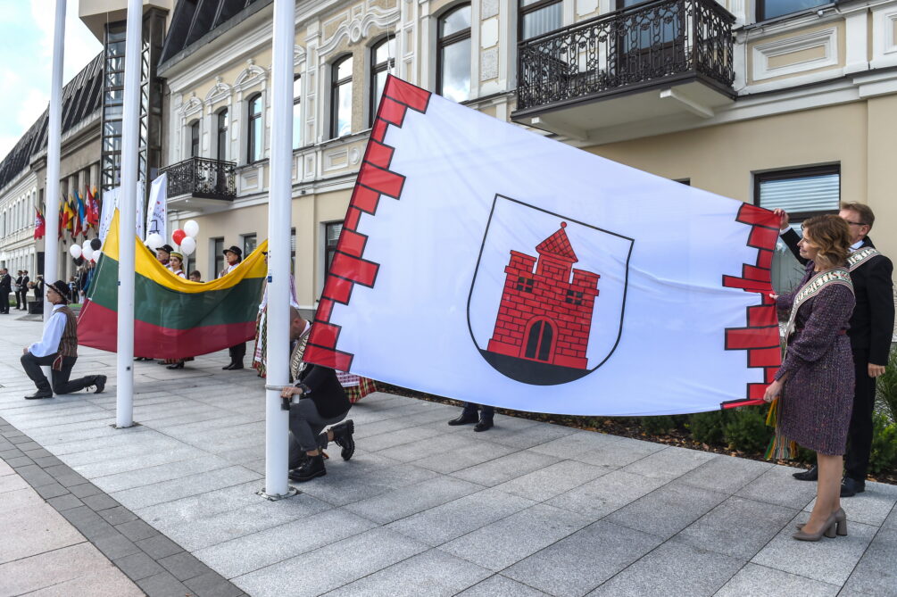 Miesto vėliavą, kurios baltame fone pavaizduoti vartai su trimis bokšteliais ir virš jų iškilusiu bokštu, prie Savivaldybės iškėlė Karaliaus Mindaugo motorizuotojo pėstininkų bataliono kariai. Ceremonija buvo palydėta trimis šautuvų salvėmis už Panevėžį ir jo žmones.