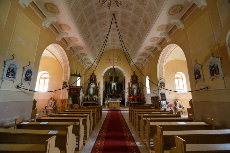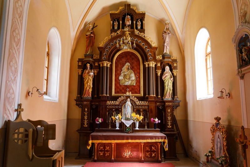 Iš šalies kukli bažnytėlė viduje atveria visą savo grožį – viduje trys puošnūs altoriai.