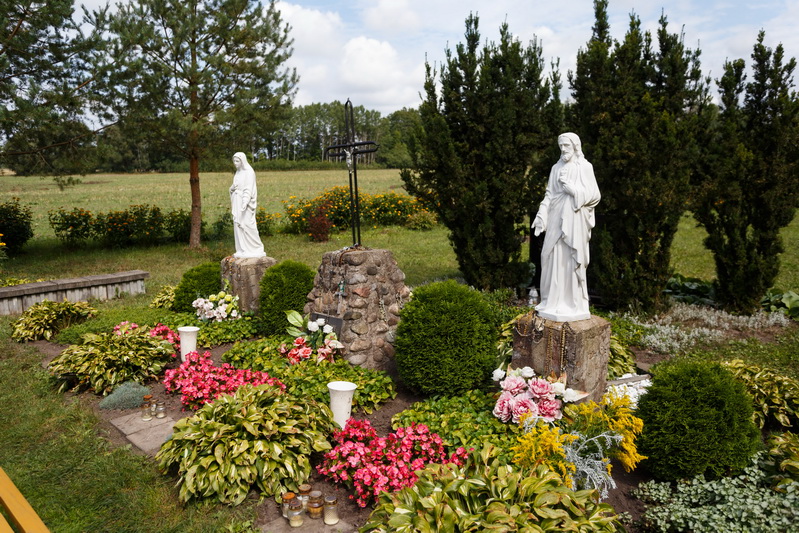 Koplyčios šventoriuje pasitinka ta pati dangiškoji Marija – mėlynu apsiaustu su žvaigždžių vainiku ant galvos ir su kūdikiu ant rankų.