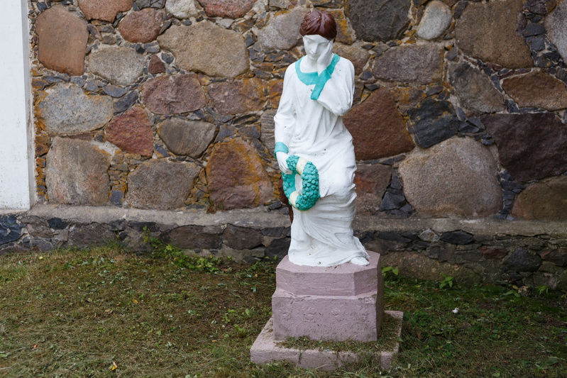Šventoriuje stovi naujai perdažyta angelo skulptūra. Ji primena liūdną senų laikų įvykį. Šią skulptūrą užsakė ir pastatė dvarininkas jo dvejų metų sūnui nukritus nuo arklio ir žuvus.