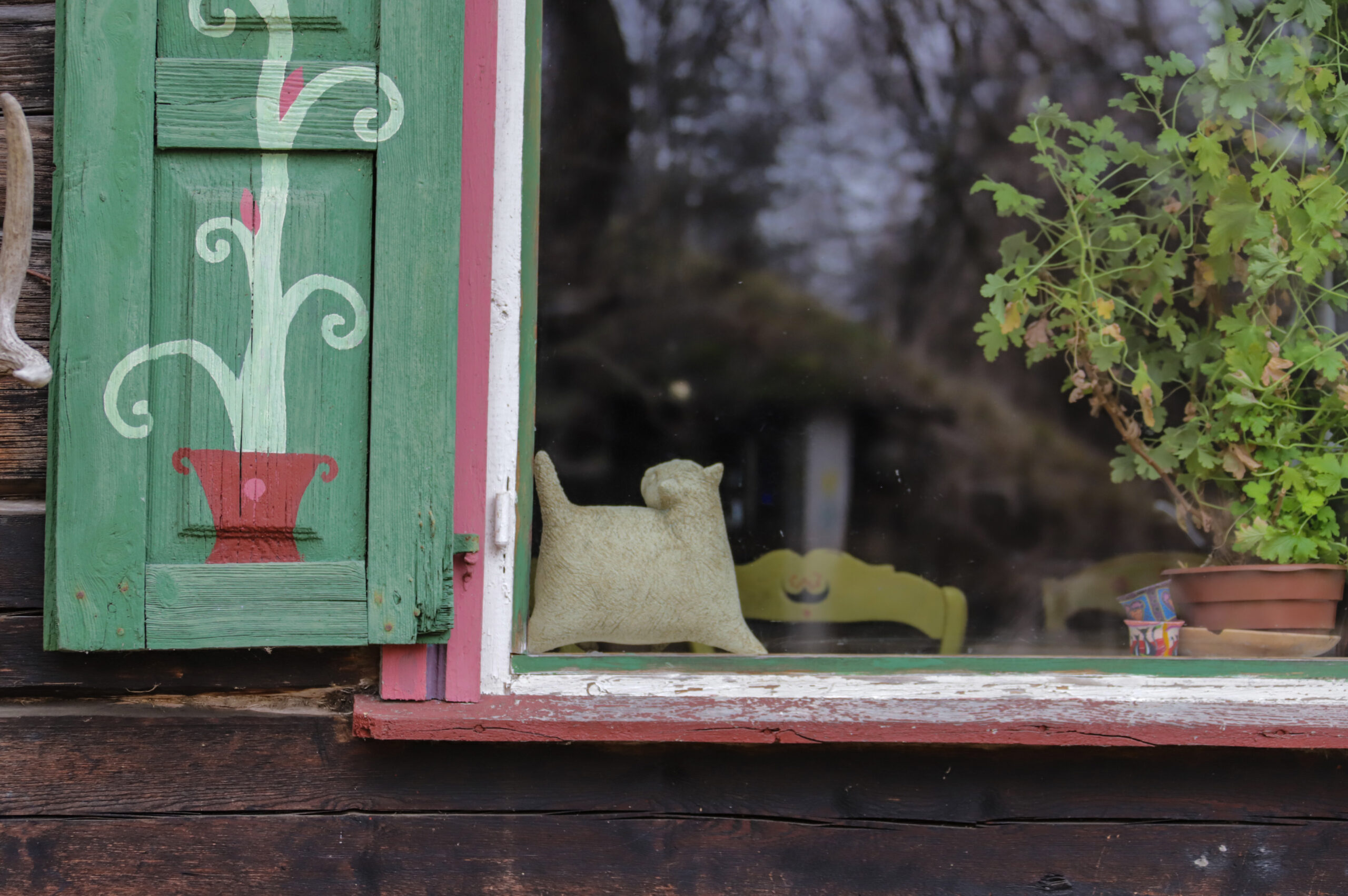 Įsukus į kiemą, akys pirmiausia užkliūva už katinais išpieštų medinių langinių, jas šeimininkui per talką padėjo ištapyti draugai. Senovinio namo viduje šiuolaikinė aplinka susilieja su lietuviškos trobos stiliumi. Kaip ir dera puodžiaus namams, troboje gausu molinių indų: puodelių, puodynių, lėkščių – visa tai R. Galiausko ir jo mėgstamų keramikų rankų darbas.