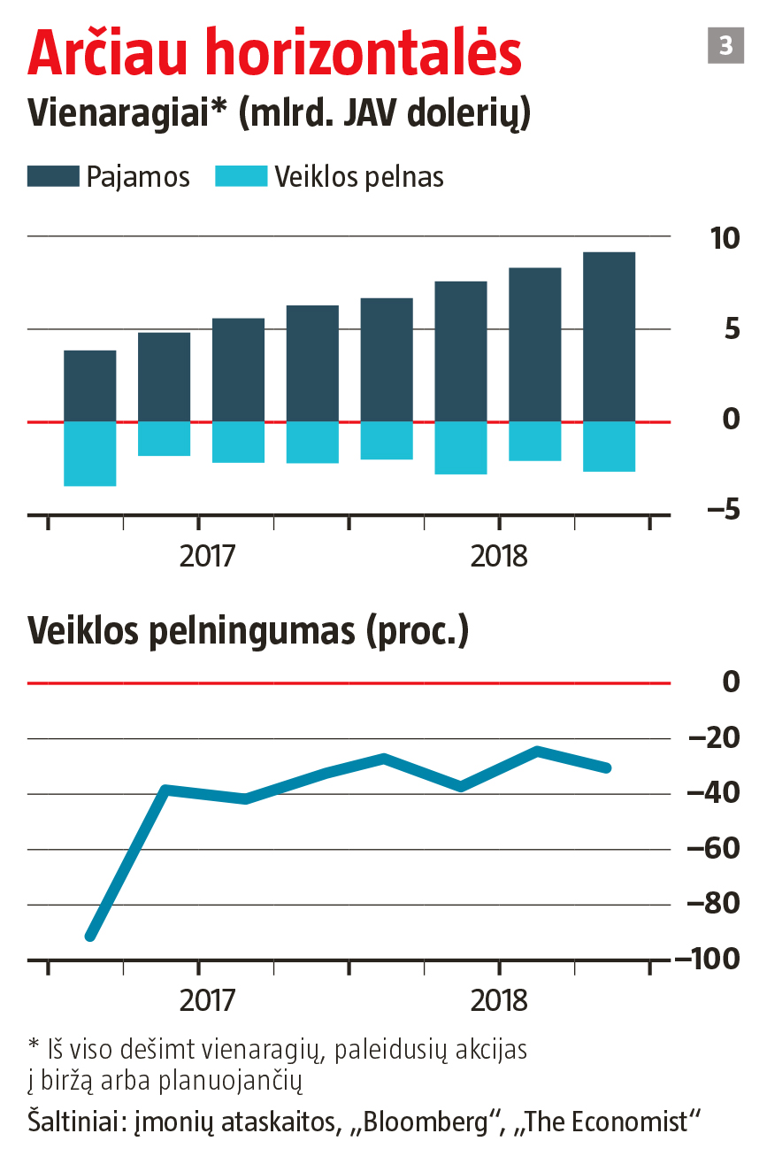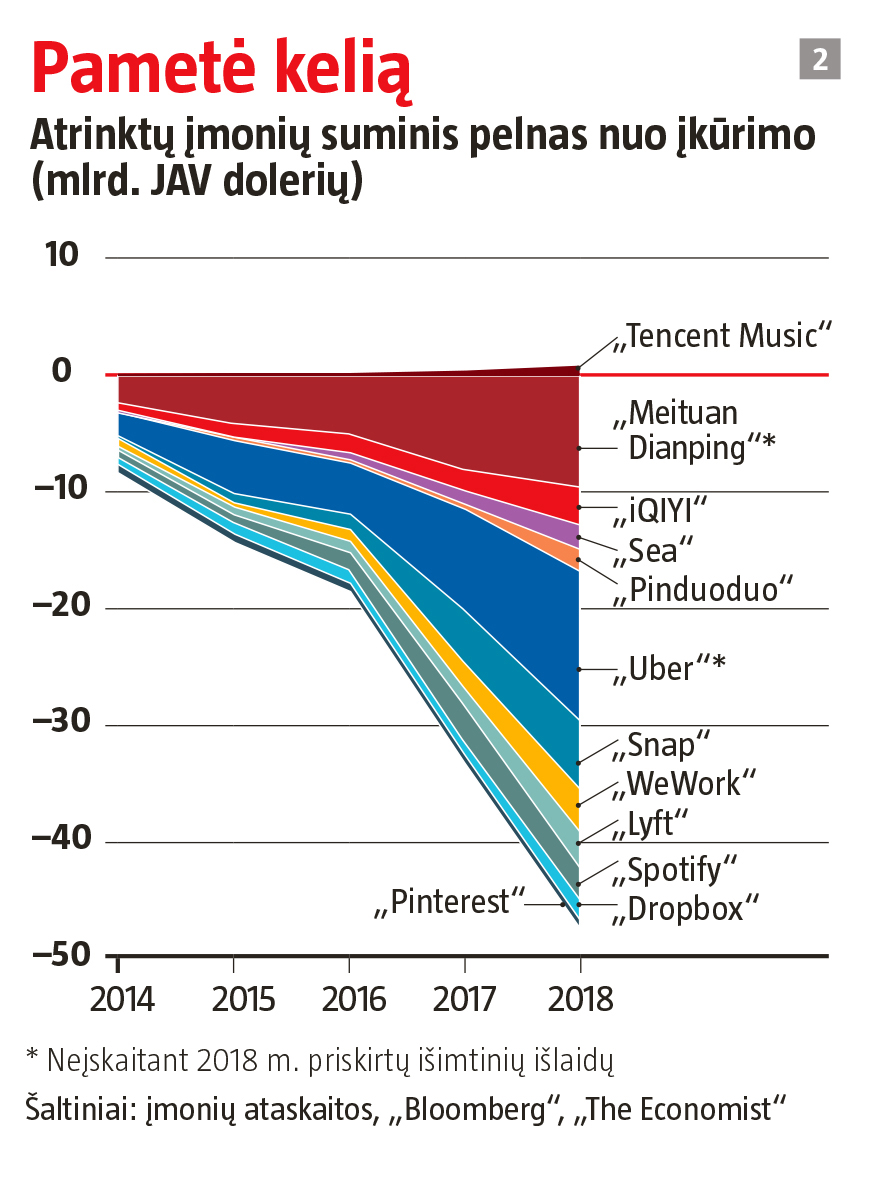 Anuomet įmonės dalijo pažadus (ir netrukus įspūdingai sulaužė), kad išaugs verslas, bus ir pelno. Tačiau šįkart pelno negauna jau išaugusios įmonės. Mūsų atrinkta grupė į augimą sukišo 47 mlrd. JAV dolerių (žr. 2 grafiką), 14 mlrd. vien 2018-aisiais. Net „Amazon“, kuri prieš ir po IPO laikyta ypač į pelną nelinkusia įmone, o 1995–2002 m. bendrai patyrė 3 mlrd. JAV dolerių nuotolių, standartais jos pašėlusiai išlaidžios. „Uber“ vien pernai prarado beveik 4 mlrd. JAV dolerių, atmetus išimtines išlaidas.