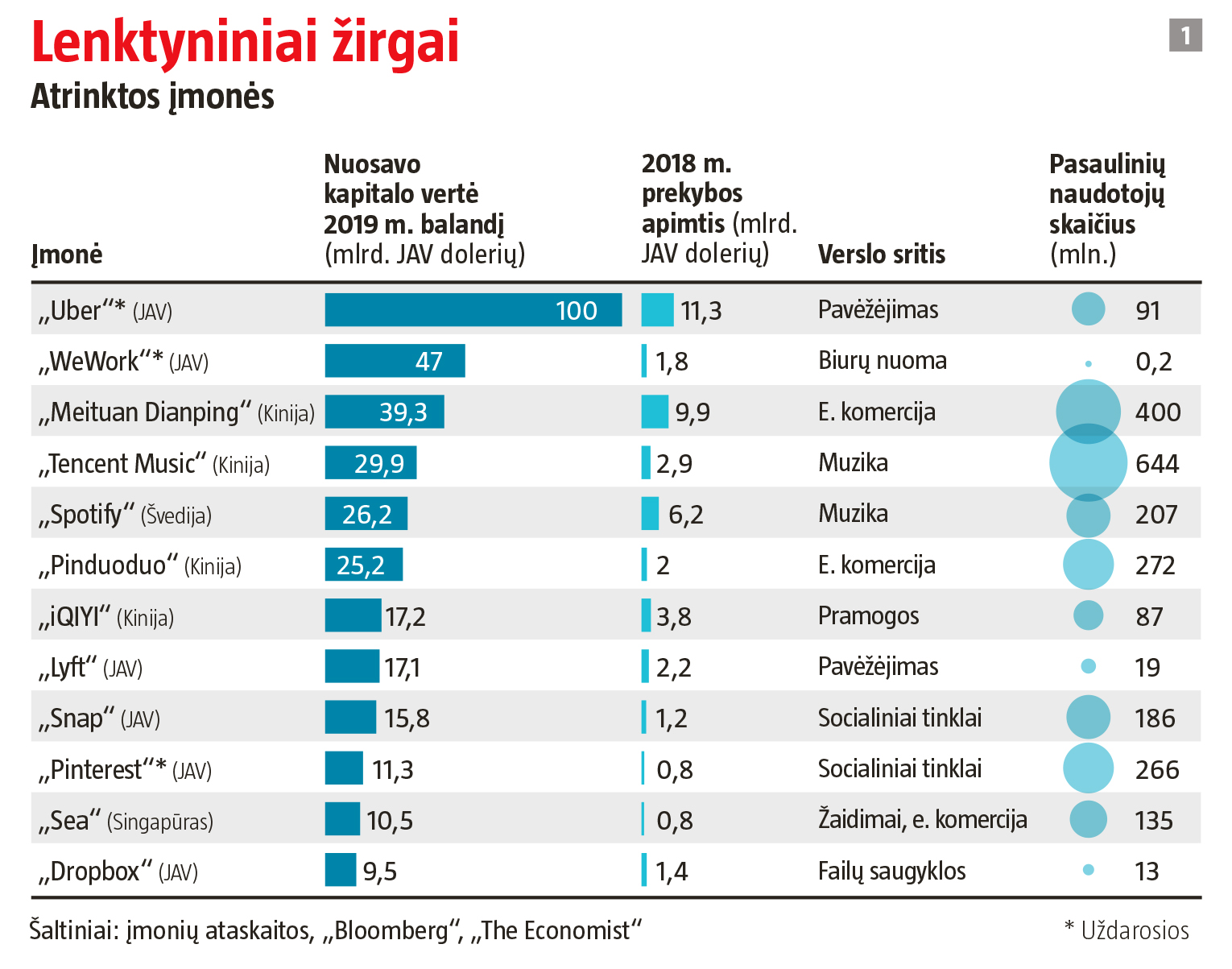 „The Economist“ aiškinosi, kas vyksta, ir ištyrinėjo tuziną buvusių bei esamų į internetines paslaugas orientuotų vienaragių iš Silicio slėnio ir kitur (žr. 1 grafiką). Imtis nėra atsitiktinė – įmonės atrinktos pagal garsumą ir prieinamus duomenis, bet apima daugumą didesnių perspektyvių bendrovių ir nemažą sektorių įvairovę: „Uber“ ir „Lyft“ iš transporto, „Spotify“ iš srautinio muzikos perdavimo, „WeWork“ iš NT, „Meituan“ ir „Pinduoduo“ iš kinų elektroninės komercijos. Įtrauktos šešios JAV, penkios Azijos ir viena Europos įmonė. Kaip daugumos kitų vienaragių, jų amžius vidutiniškai siekia dešimt metų.