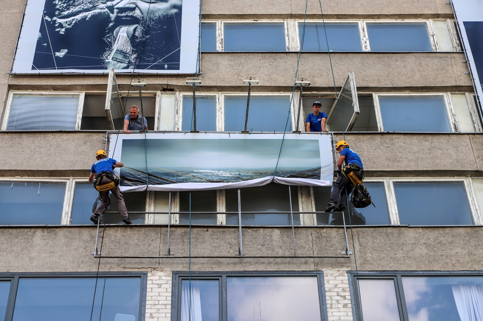 Pirmoji paroda ant viešbučio fasado iškabinta dar 2017-aisiais. Panevėžyje tai buvo netikėtas, dar nematytas kultūrinis reiškinys. Praeiviai pakėlę galvas apžiūrinėjo milžiniškus tentus su žymaus fotomenininko Algimanto Aleksandravičiaus darbais – režisieriaus Juozo Miltinio svečių portretais.