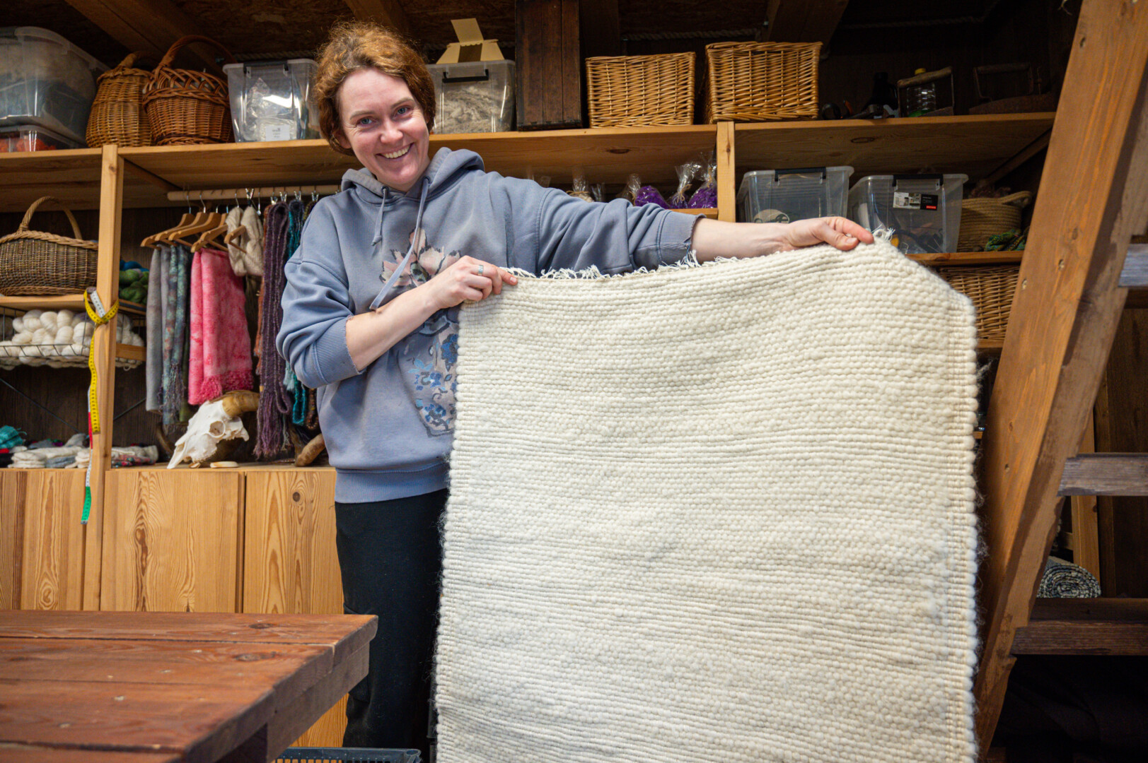 Iš storai suverptų siūlų G. Vildzevičienė kilimus ir kilimėlius audžia, iš vilnonių ožkų garbanų suvenyrų prigamina.