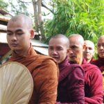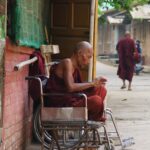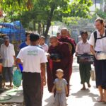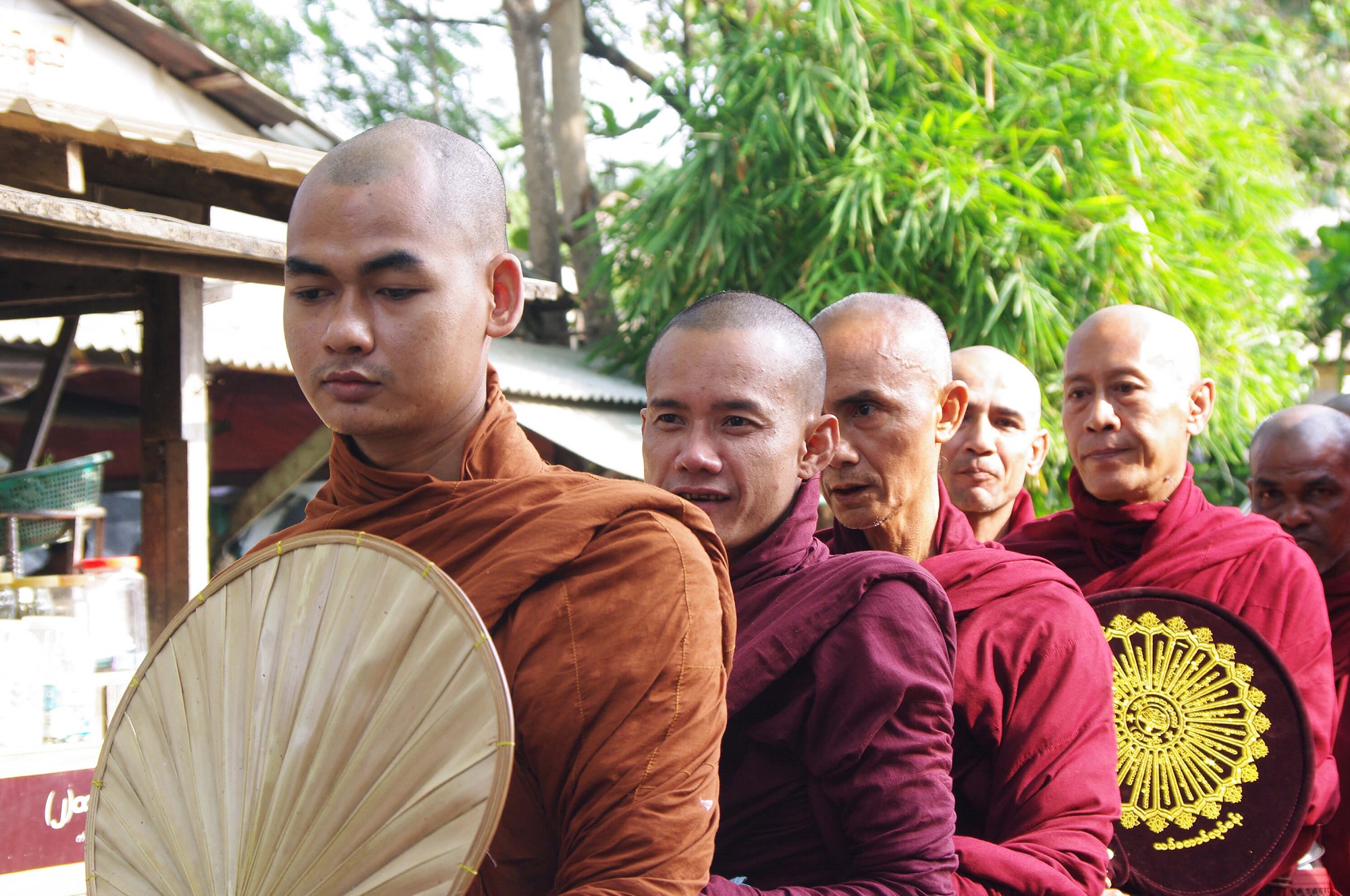 Su aštuoniais purpuro spalvos apdarais vilkinčiais vienuoliais basa einu Jangono – buvusios Mianmaro sostinės – gatvėmis. Aplink zujant nepertraukiamai eismo grandinei, tylėdami renkame dienos aukas. Lėkštėmis su maistu ir kitomis gėrybėmis nešini žmonės rikiuojasi prie suklypusių medinių trobelių ar prabangesnių dviaukščių namų. Jų link žengiame per purvą, paplavas, šiukšles, žvyrą ir karštą asfaltą.