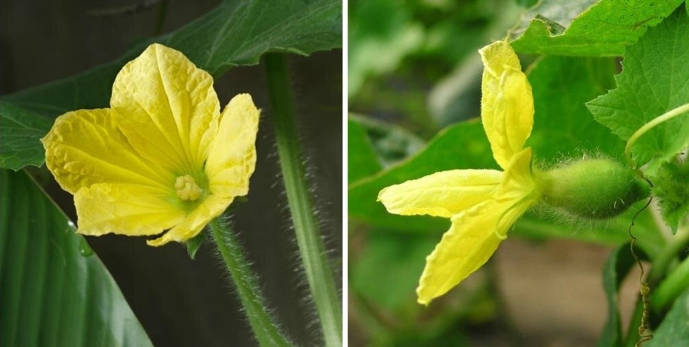 Jeigu melionai žydi, bet vaisių vis nemezga, gali prireikti dirbtinio apdulkinimo. Rytą, kai oras sausas, nukirpkite vyriškus žiedus (kairėje), nuskabykite žiedlapius ir šerdele palieskite kiekvieną moterišką žiedą (dešinėje) po 3–5 kartus. Po kelių valandų procedūrą pakartokite. Jeigu vyriškų žiedų ant augalo nėra, galima naudoti analogišką agurko žiedą.