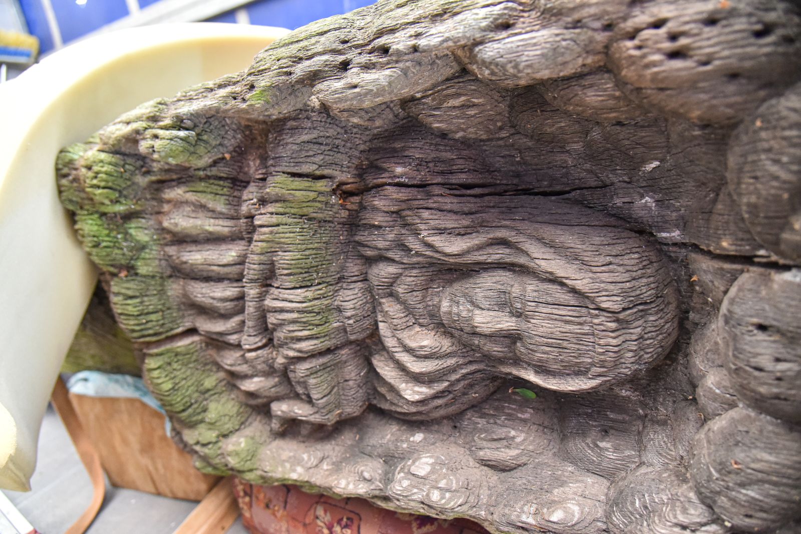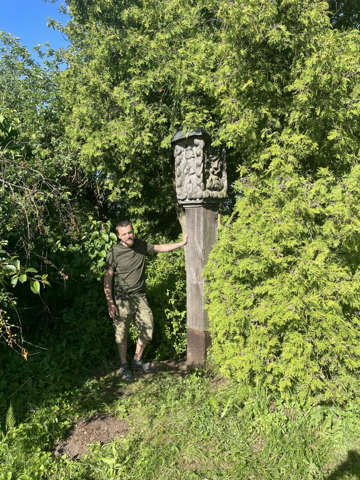 Tiesa, jo būklė nėra pati geriausia – koplytstulpis stovėjo tarp labai tankiai augusių tujų. Laimė, jis turi metalinį stogelį, šiek tiek apsaugojusį medieną nuo lietaus ir sniego.